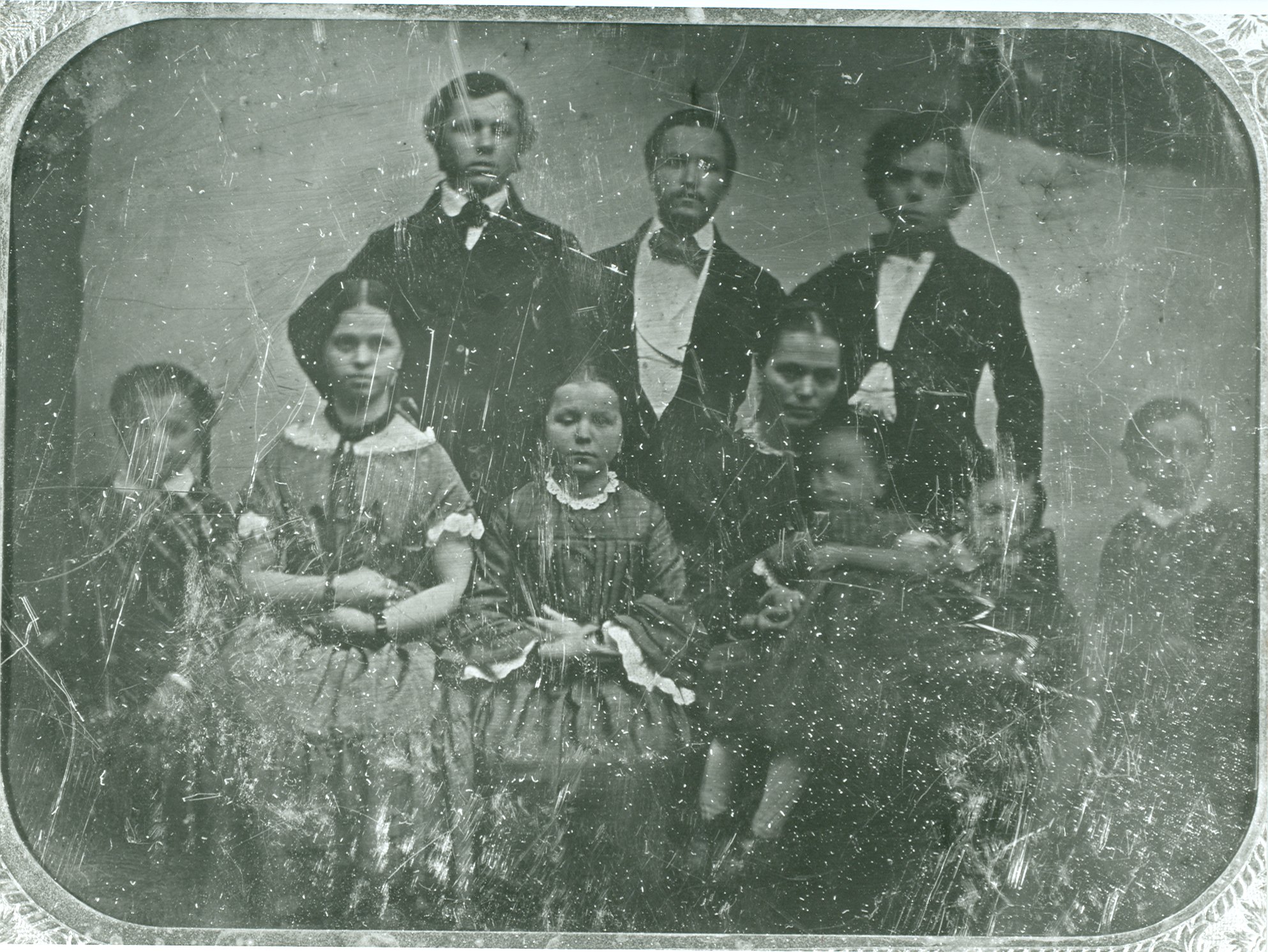 - Half-plate daguerreotype is enclosed in a wood-frame case with two metal hook-and-eye latches. The outside of the case is covered in leather, embossed with a floral motif. The inside has gilt edges and is lined with floral-patterned red velvet. The daguerreotype has an ornate [brass?] mat and is beneath glass. A woman and six children of varying ages are seated in the foreground; three men are standing behind them. Based on records of the first instructors the men are probably (from left): Bryce Patten, first superintendent of the school; his brother, Otis, who was visually impaired and studied with Dr. Howe at Perkins; and Joseph Smith, the school's music teacher who was blind. The woman and girls have center-parted hair pulled back. One girl's dress has belled sleeves trimmed with wide lace. Another girl wears a neckband. The men are dressed in dark suits. The men on either end have dark bow ties. Vendor dates the picture and case to the 1850s. There were daguerreotypists working in Louisville from the late 1840s.