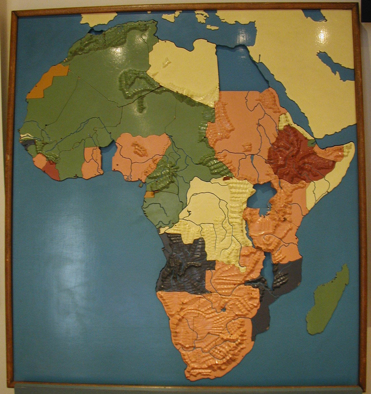 - Carved wood relief map of Africa; painted and dissected; bodies of water are painted blue, rivers are recessed; mountains are carved in relief; countries are enameled pink, green, yellow, gray, red, and gold; principal cities indicated by nailheads, capitols are pointed and enameled red, others are rounded and enameled white; all pieces stamped on reverse, "#2"; reverse sides left unpainted; missing Spanish Morroco.