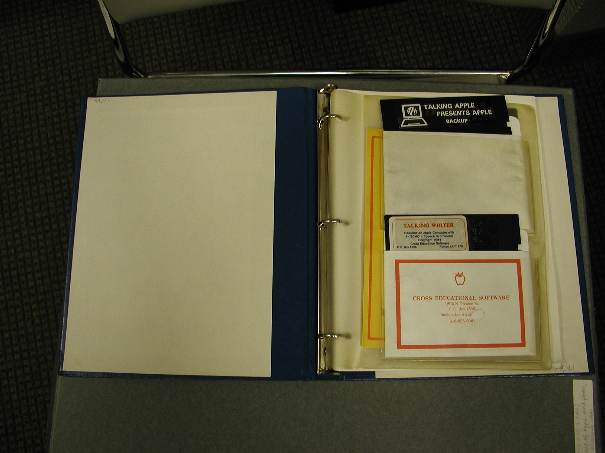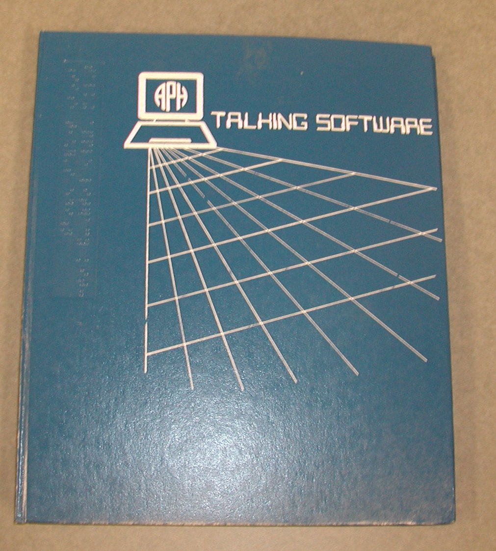 - Blue faux leather covered three-ring binder; cover has screen-printed white web extending out from computer icon with "APH" on screen and legend "TALKING SOFTWARE" in a computer font; also embossed in braille on left; printed on spine, "TALKING APPLE LITERACY KIT: IIe/Teacher's Edition"; clear vinyl sleeve holds three black 5.25" floppy disks in white paper sleeves and two audiocassettes; disks are labeled "Talking Apple Backup," "Talking Writer," and "Talking Apple Master"; cassettes are an audio version of the print and braille copies of the manual also in the binder.