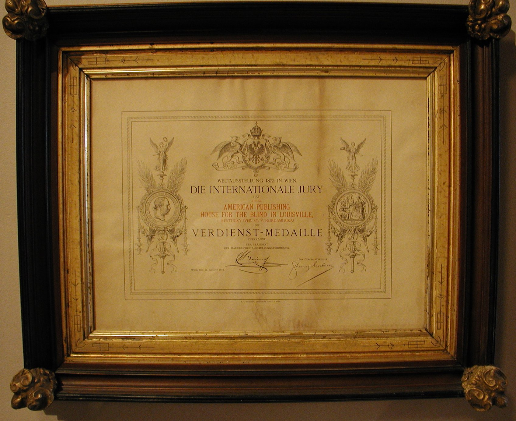 - "Weltausstellung 1873 in Wien. Die Internationale Jury hat dem American Publishing House for the Blind in Louisville, Kentucky (Ver. St. V. Nordamerika) die Verdienst-medaille Zuerkannt." --text of award.