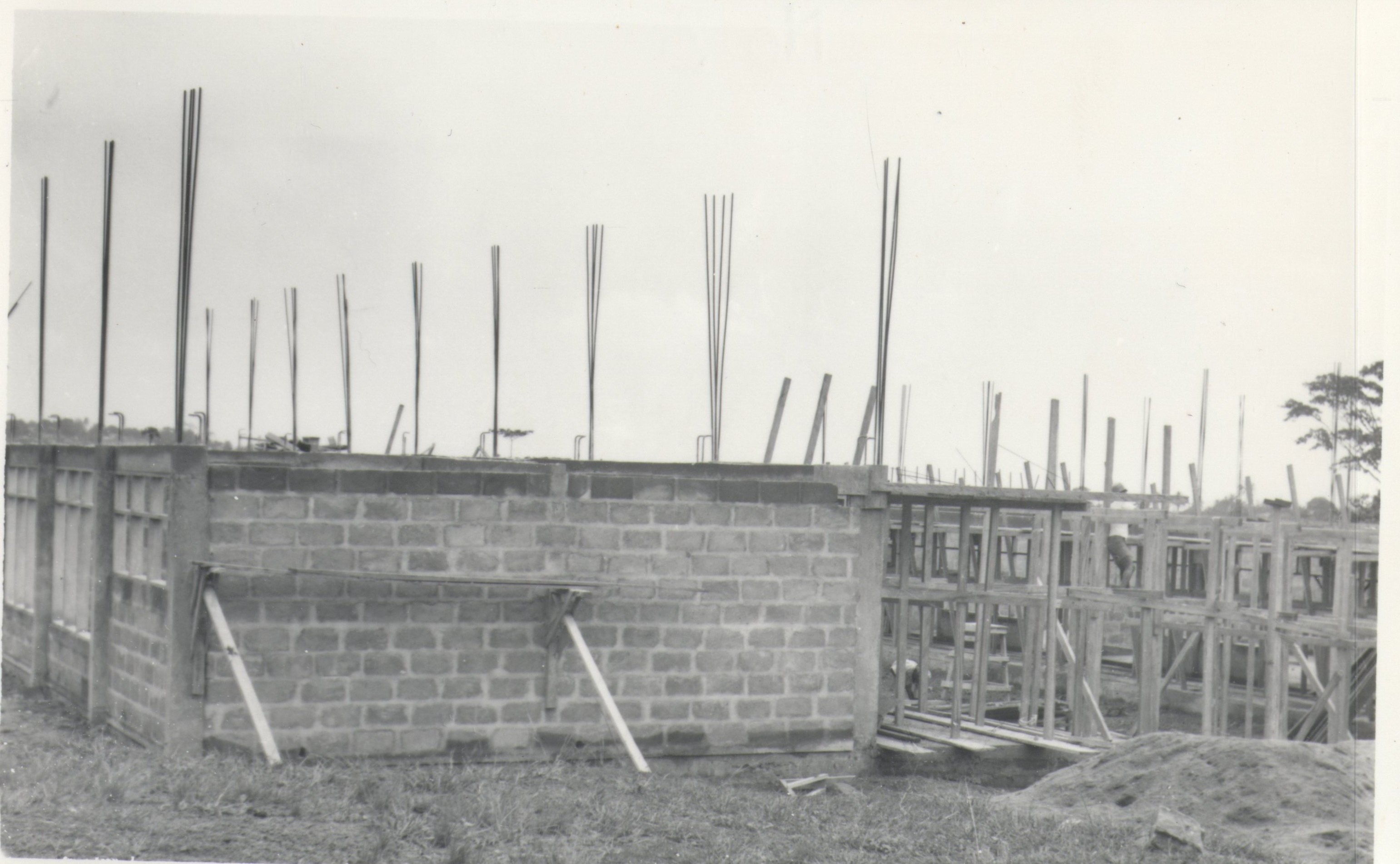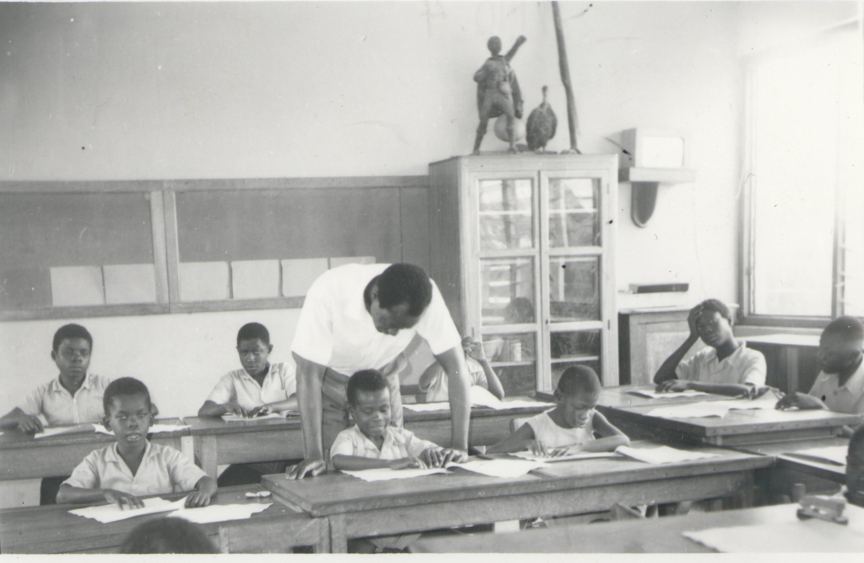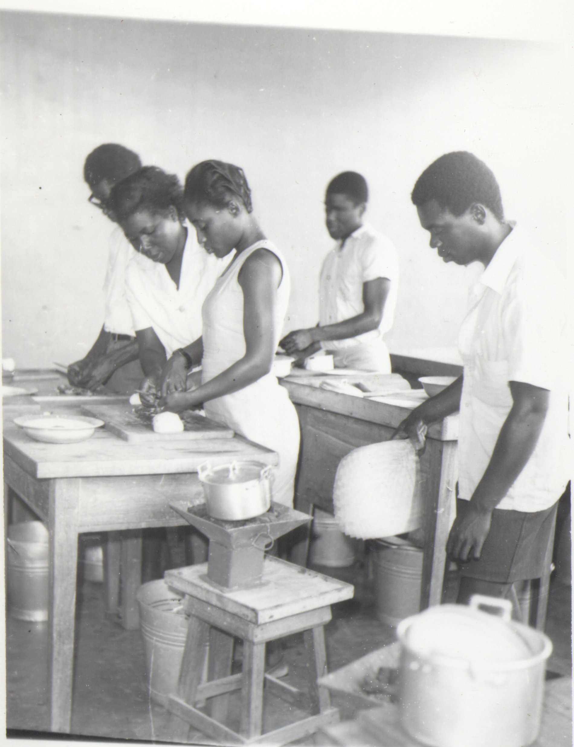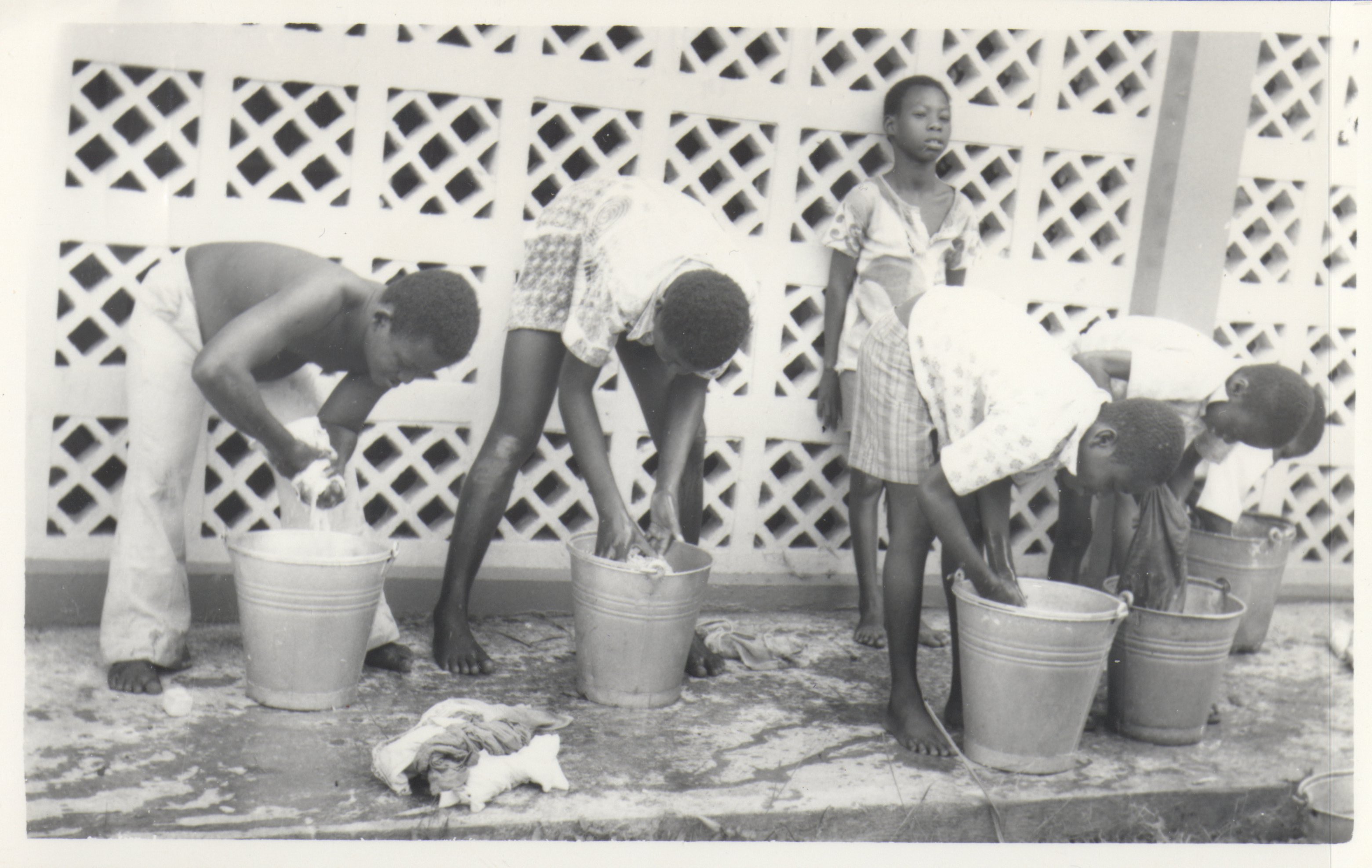 - (4) BW prints, picture postcards, Akropong School for the Blind; .429: Children doing laundry in steel bucket on a porch; .430: Teacher working with students preparing food at two tables; .431: Cinderblock building under construction, caption, "uncompleted Craft Block building"; .432: Boys sit at desks in classroom; a teacher leans over the boy in the middle of the shot; blackboard and glass display case in background.