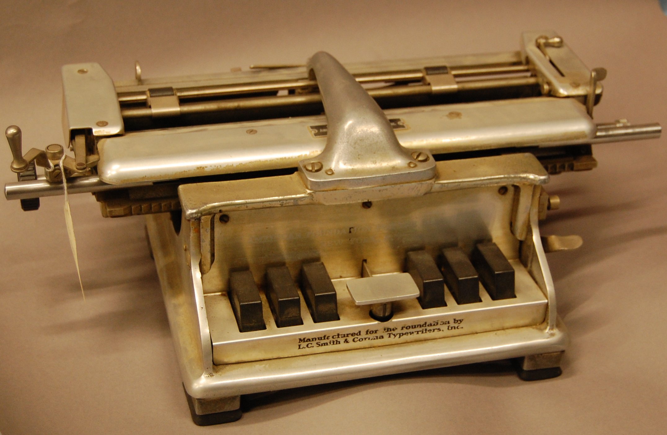 - Braillewriter is of cast aluminum alloy, highly polished on the outside and lacquered; black type stenciled on the front reads "American Foundation for the Blind Inc. New York, N.Y."; serial number is #6-2775.