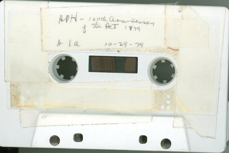 - One audiocassette recording of an APH event that included a recognition of APH retirees Finis E. Davis, former Vice President and General Manager; Marjorie Hooper, former Braille Editor; and Virgil Zickel, former Plant Manager; and a preview showing of a newly developed slide/cassette program about the history of APH and the 1879 Act. Program speakers on the tape are Carson Y. Nolan, President of APH; Marjorie Hooper; and J. Max Woolly, Superintendent of the Arkansas School for the Blind. Event was held during the 1979 APH Annual Meeting, at the Stouffer's Louisville Inn, from 1:30 p.m. to 4:30 p.m. Handwritten on cassette label: "APH - 100th Anniversary of the Act 1879, 10-29-79, #1a."
