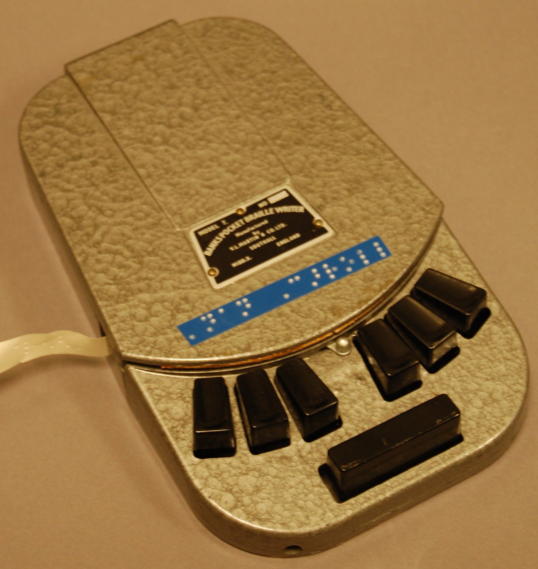 - Cast aluminum pocket braillewriter, rectilinear with rounded corners; main body coated in crinkled gray enamel; six black plastic braille keys in slightly circular arrangement, black plastic space bar below; lever in middle of keyboard opens lid on top to reveal paper tape roller and diebox; metal tag pinned to lid, "MODEL 7, No. 3378/ BANKS POCKET BRAILLE WRITER/ Manufactured by V.L. MARTIN & Co. LTD/SOUTHALL/MIDD.X. ENGLAND"; cast into chassis inside writer, "1067494 BIRMAL"; base padded with cork; blue Dymo Tape braille label on top, "Nan Carroll".
