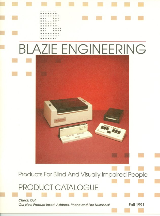 - The Fall 1991 catalog of assistive technology products, including braille notetakers, braille printers, braille translation software, screen readers, and speech synthesizers, and optional accessories. Some products are from Henter-Joyce, Raised Dot Computing Company, IBM, G.W. Micro, Duxbury Stystems, and Enabling Technology. Includes a staff directory. Paper cover, saddle-stitched. Cover photo in color; remainder in black-and-white.