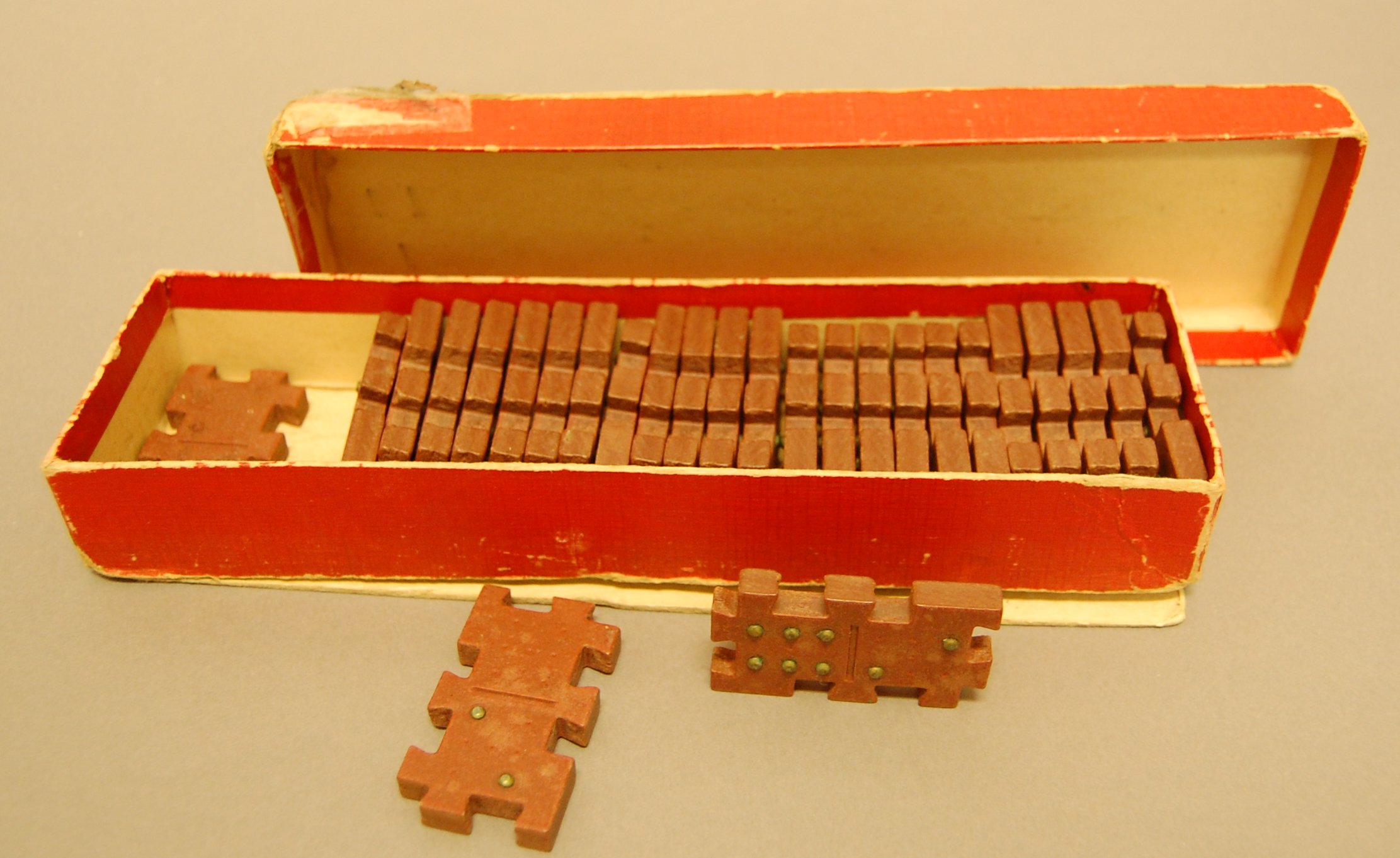 - Twenty-six interlocking dominoes made of wood with raised metal dots to indicate the number of each domino. Stored in orginal red cardboard box; name and location of manufacturer printed inside, on bottom.