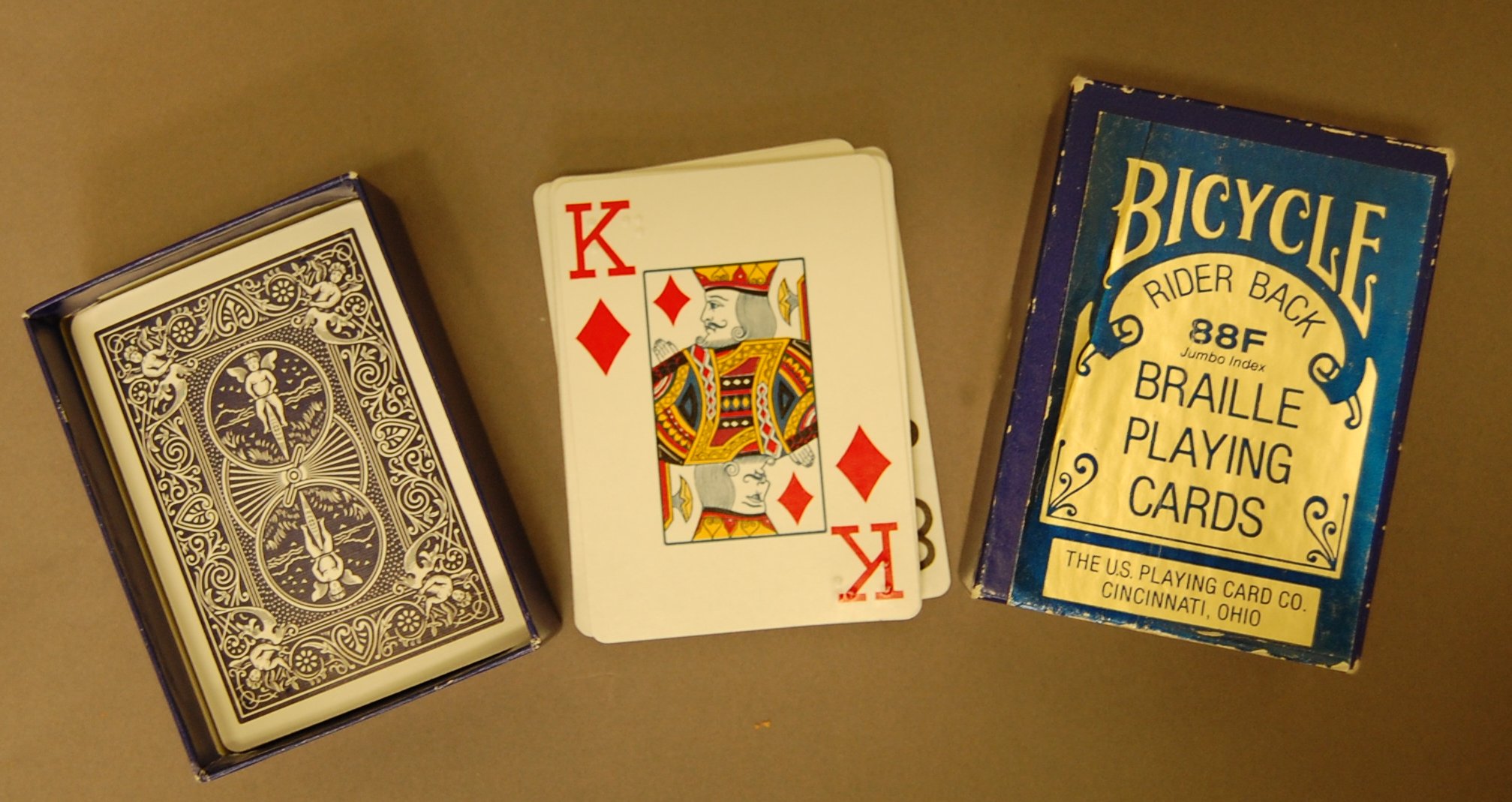 - Fifty-four playing cards are in a blue box with removable lid. The backs of the cards are blue and white with an intricate Bicycle Rider Back design. The upper left and lower right corners on the front of each card are embossed with braille to indicate the number and suit. A label on the front of the box reads "Bicycle Rider Back 88F Jumbo Index Braille Playing Cards, The U.S. Playing Card Co. Cincinnati, Ohio."