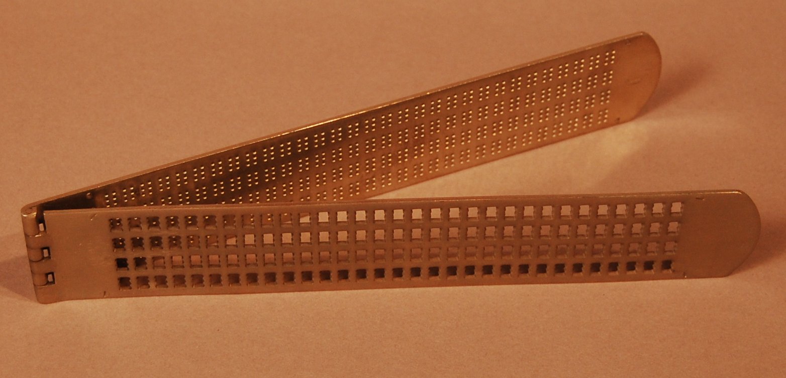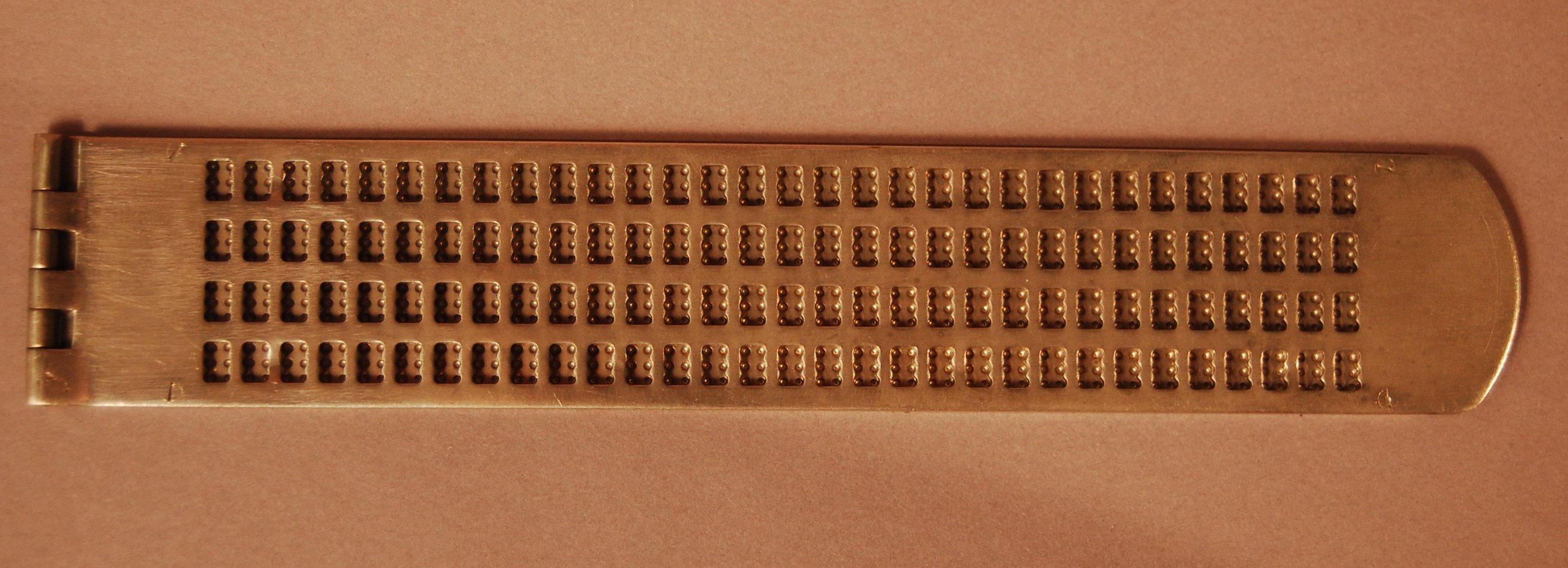 - Hinged braille slate has four lines of 31 cells; cell windows on top frame have slight indents to guide placement of stylus; registration pins (down) in top plate; curled piano hinge; open end of frames are rounded; "#9044" is handwritten on a foil label attached to the back. "RNIB" is stamped on the top right end of the bottom plate.