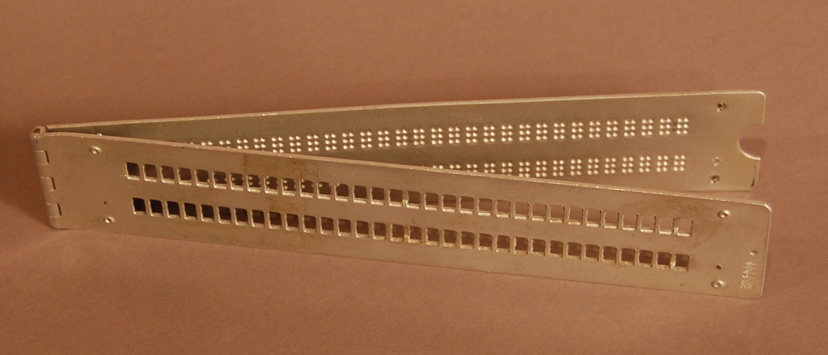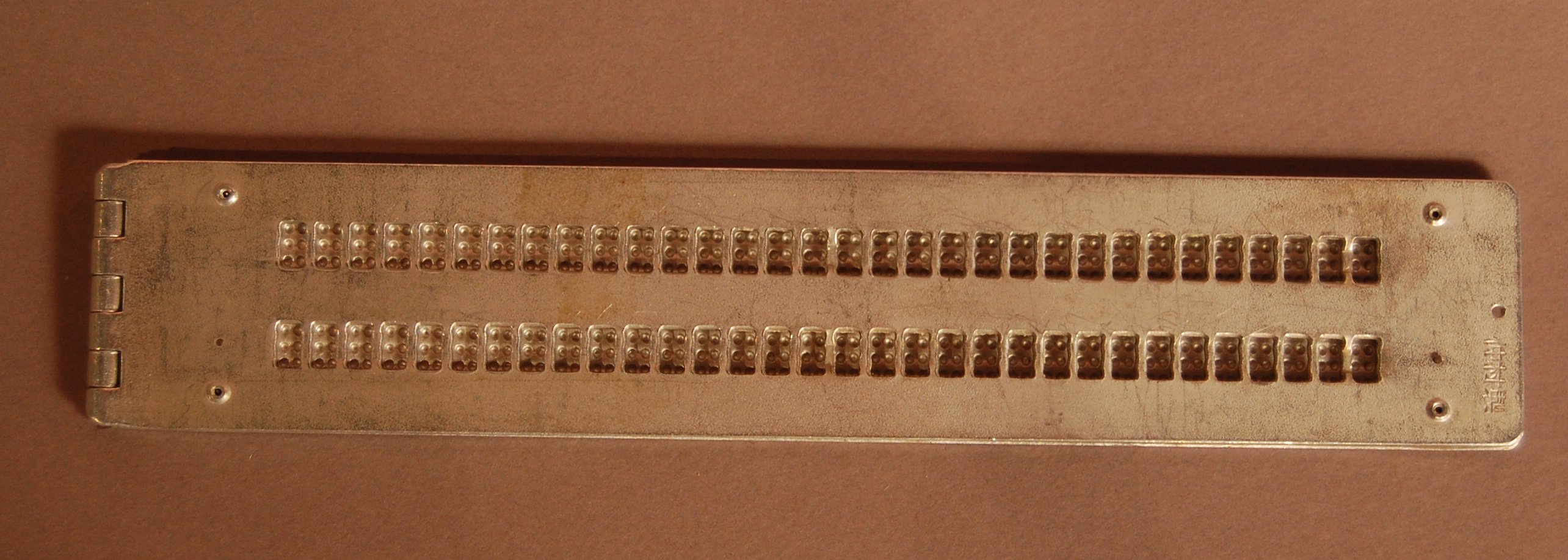 - Hinged pocket slate; 2 lines of 32 cells; 2 pins (down) in top plate; 4 pins (up) in bottom plate; Japanese characters stamped on front of top plate, lower right corner.