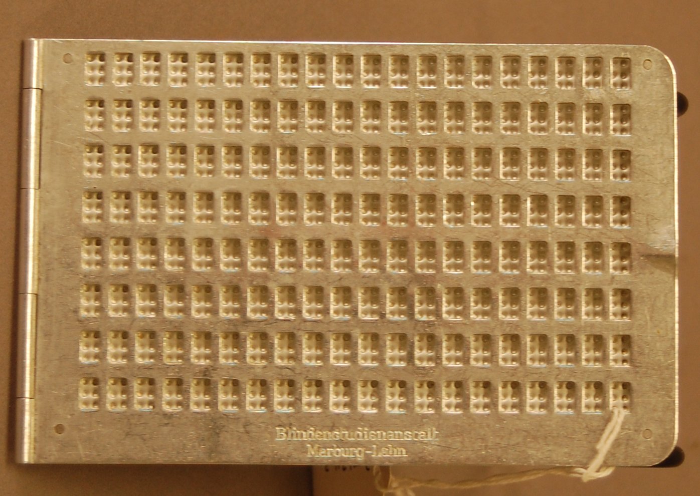 - Hinged pocket slate; 8 lines of 20 cells; pins in top plate. "Blindenstudienanstalt Marburg-Lahn" --top plate.