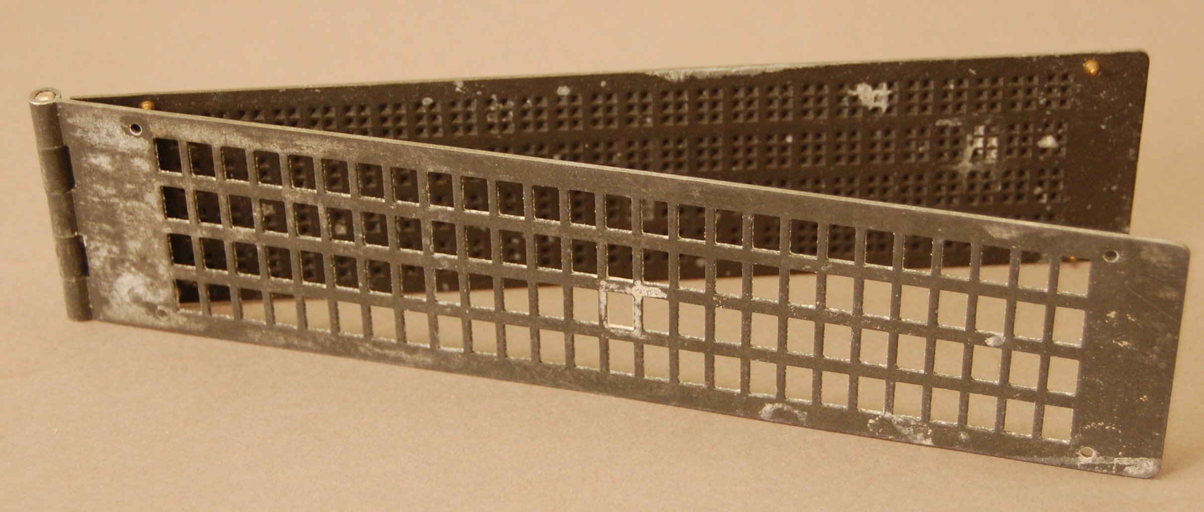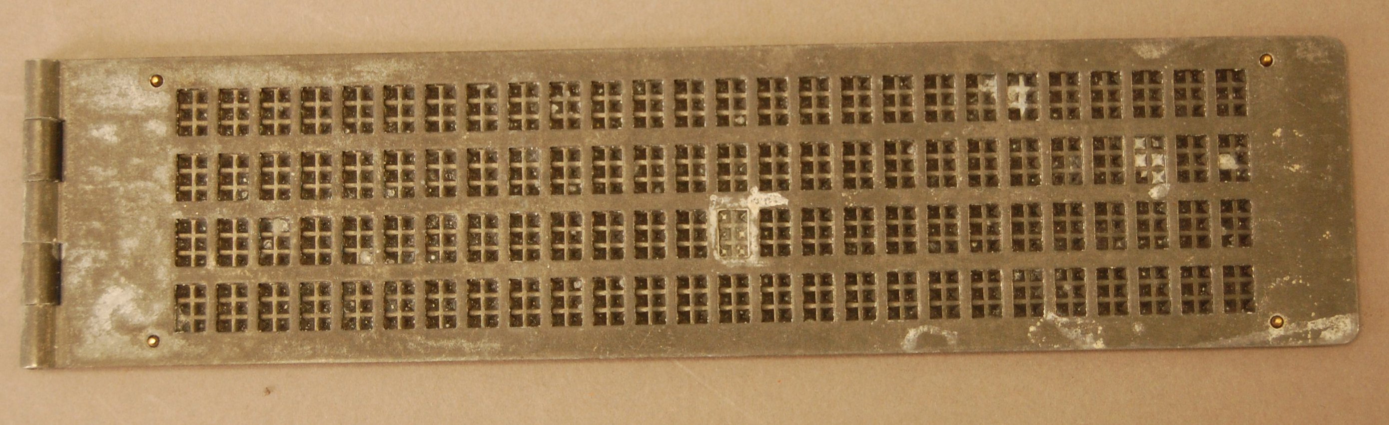 - Hinged pocket slate; dark gray zinc alloy; 4 lines, 26 cells; brass pins in bottom plate.
