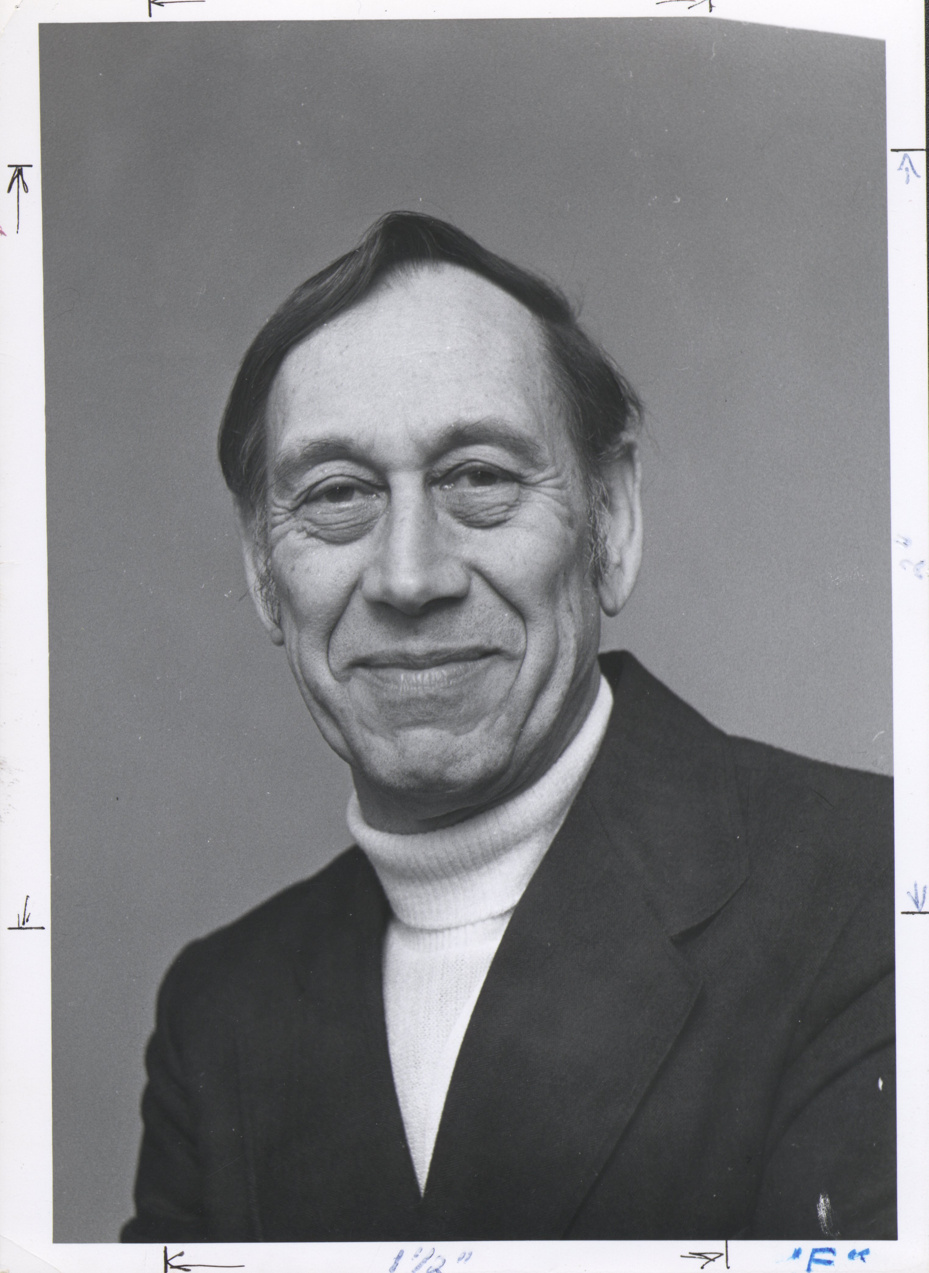 - Portrait photo of C.F. Messinger, head and shoulders shot of Messinger wearing a white turtle neck sweater and dark sport coat, smiling.