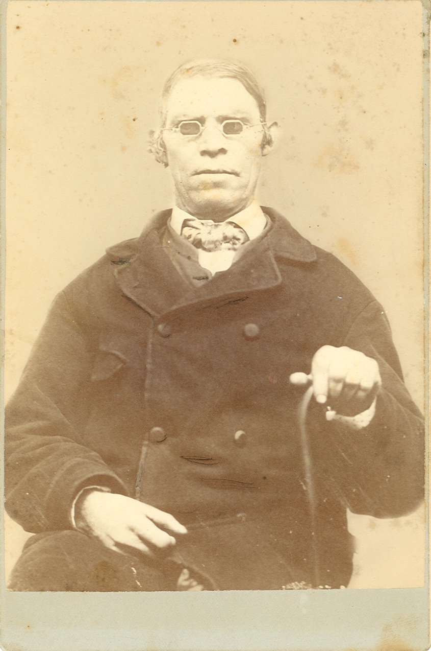 - The photo is mounted on a gray card. It shows a blind man with tinted eyeglasses, holding a cane in his left hand. He is wearing a light-colored shirt with a patterned tie and a dark jacket with a double row of buttons. On the back of the card, at center, is printed "Stones' Great Northern Photo. and Copying House, Potsdam, N.Y." Above this, in pencil, is handwritten "Uncle," which has been slightly erased, and "Benjamin D[ea?]n." Slight foxing and dark spots on photo; back has yellowed.