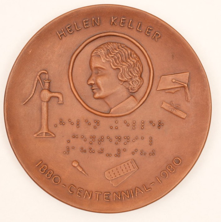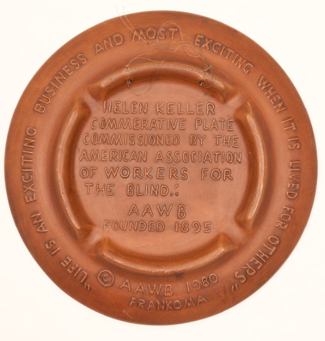 - Earthenware plate with brown glaze has the name of Helen Keller in raised letters at top center; beneath this, framed in a circle, is a raised left-facing profile of Keller; raised illustration of a water pump is shown at left, and of a graduation cap and a rolled diploma at right; raised illustrations of a stylus and pocket slate are at bottom center; "Helen Keller Centennial 1880-1980" appears in braille, centered beneath her profile; "1880-Centennial-1980" appears in raised numbers and letters along the bottom edge.