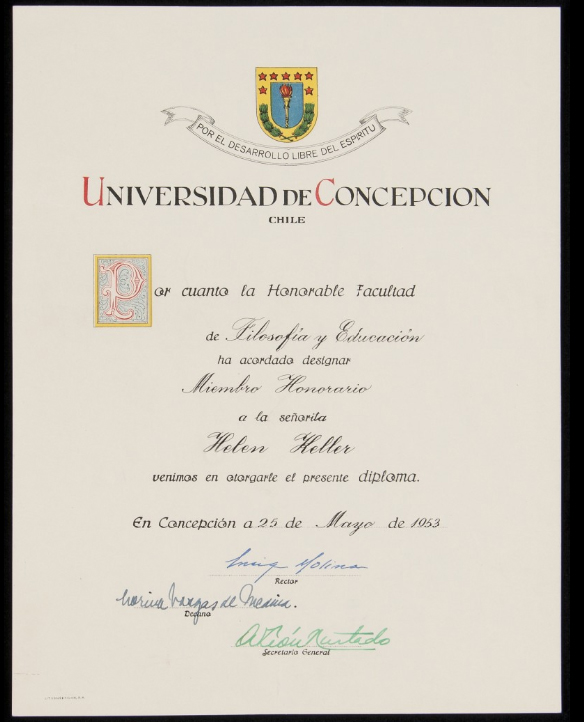Certificate, Honorary Member of Faculty of Philosophy and Education Certificate Accession Number: 2020.1.8.172Scope & Content: Diploma from the Universidad de Concepcion making Helen Keller an honorary member of the faculty, May 25, 1953Interview Date: / /Collection: AFB Helen Keller Archive Back to the collection