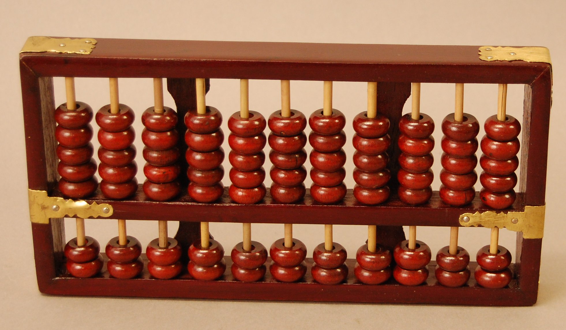 - The frame and beads of the abacus are made of wood. There is decorative gold metal trim on the corners and the sides of the frame. The beads have a diameter of approximately 5/8 in. There are 11 columns of beads; 2 above the wooden bar and 5 below. A metal label attached to the frame has Chinese characters and has the following printed in English "Diamond" and "Made In China."