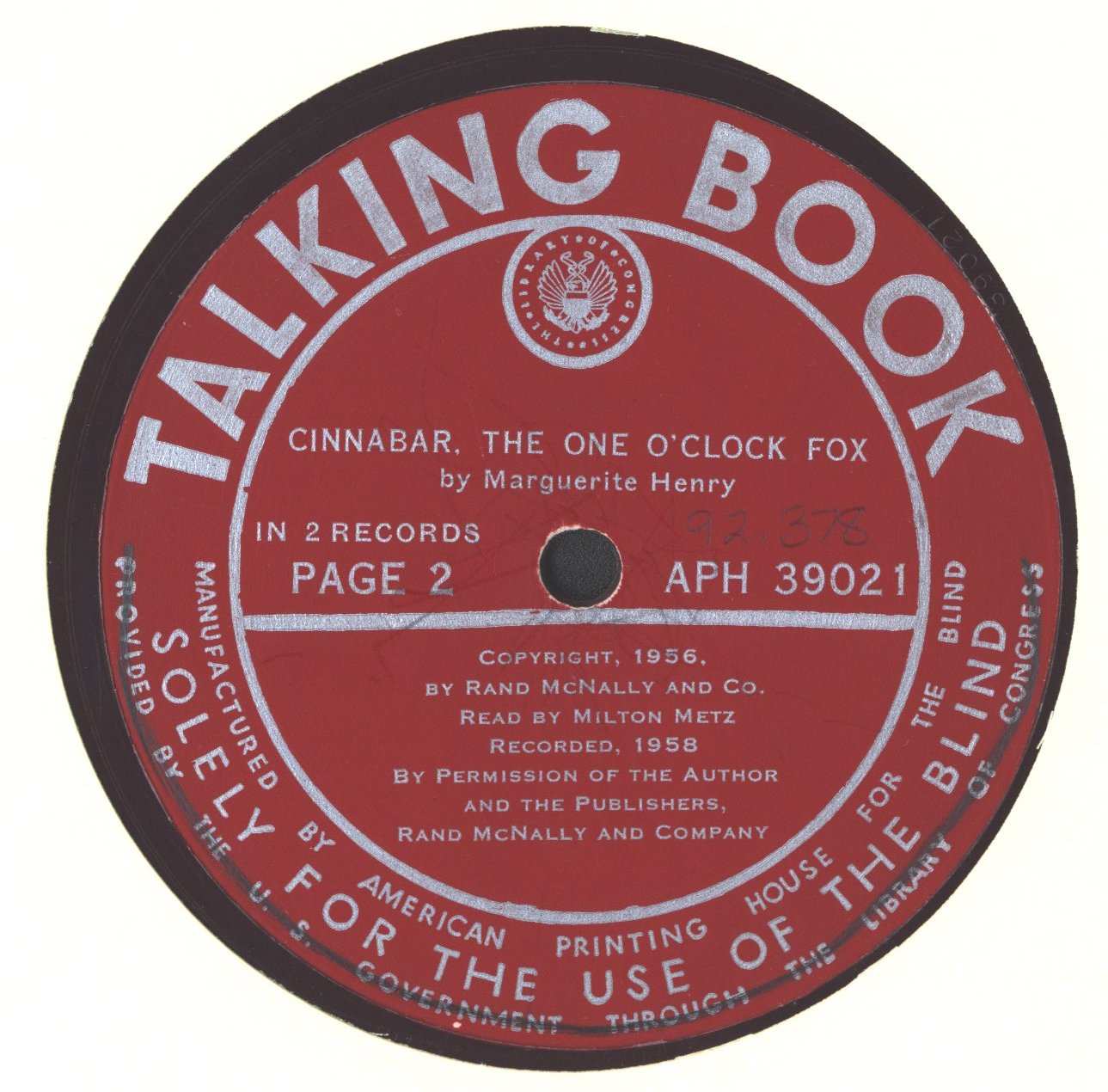 - APH 39021-39022. Red transparent vinyl. Recorded for the Library of Congress. Reproduced from: Rand McNally, New York, 1956. [Narrator] Metz, Milton