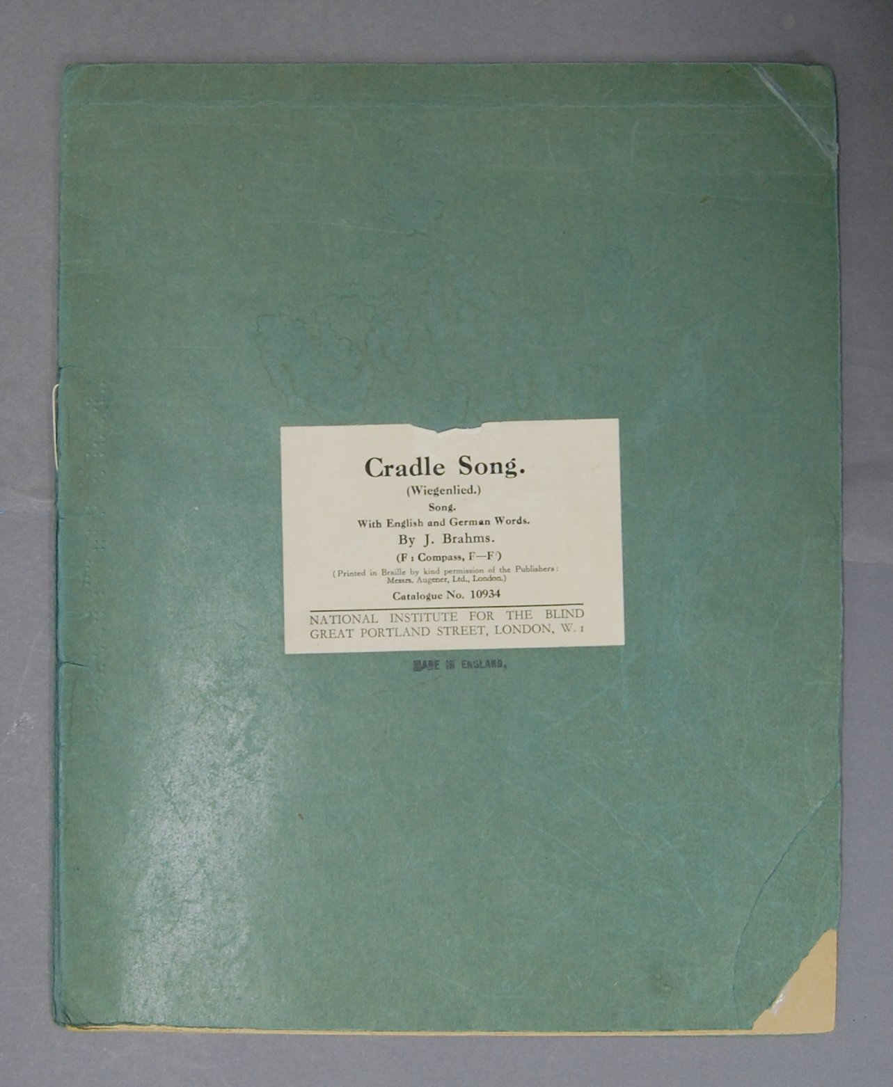 - Blue paper cover with print label pasted on front; saddle stitched; text embossed in British Braille Grade II; interpointed; page numbers on interior are in raised letters; Catalog# 10934.