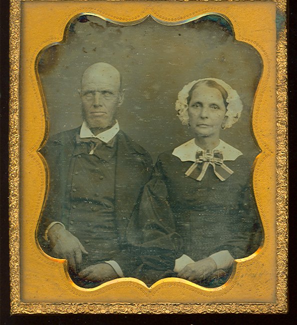 - 1/6 plate daguerreotype has a brass mat covered with glass and is enclosed in a brass preserver that is embossed with a small design. Gold sealing tape (original?) is visible on the back. Seated man and woman are identified on a separate paper as Cyrus Blood Jones and Matilda McDaniels Jones. He is wearing a dark jacket and a vest with two rows of buttons. He has a short beard, but no mustache. She is wearing a light cap and a dark dress with a light-colored collar and a striped bow. The dress has bishop sleeves with light-colored cuffs. The bodice is pleated above the waist.