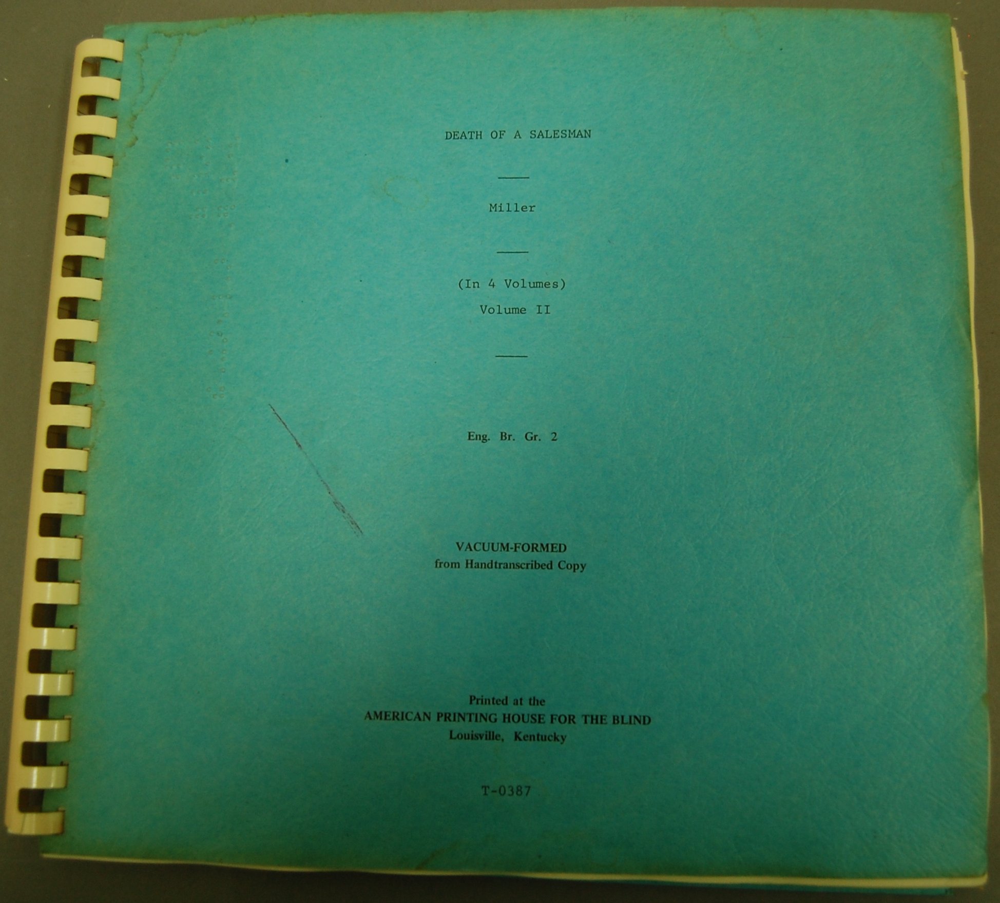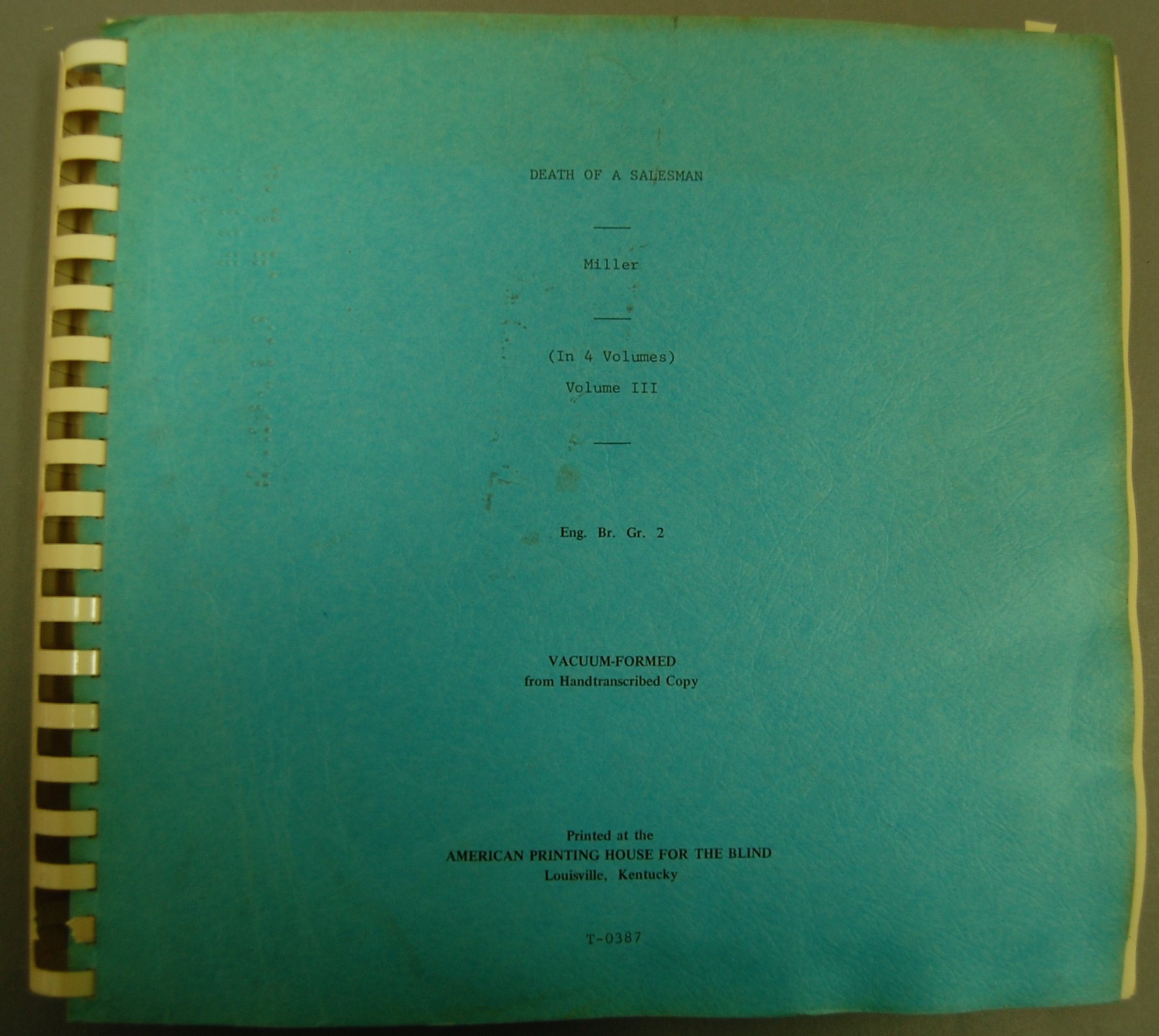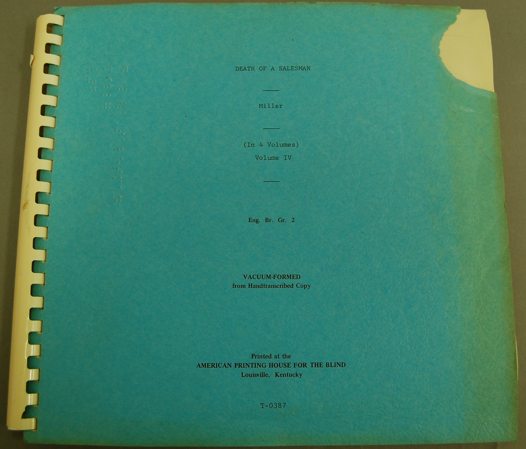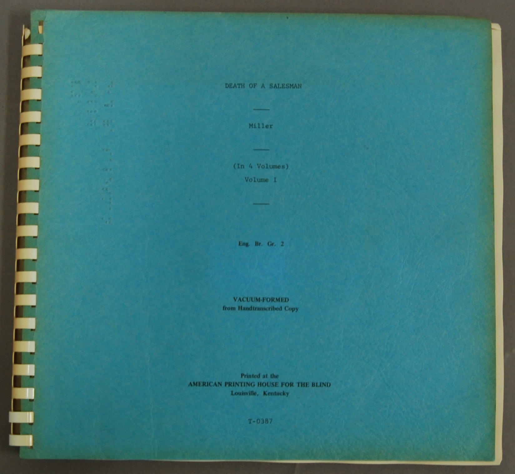 - For grades 9 to adult. Transcribed by the National Council of Jewish Women, Cincinnati, Ohio, 1967. Grade 2 braille. On cover: "Vacuum-formed from handtranscribed copy." White plastic comb-binding; blue paper covers. APH catalog no. T-0387. .196a - volume 1. .196b - volume 2. .196c - volume 3. .196d - volume 4.