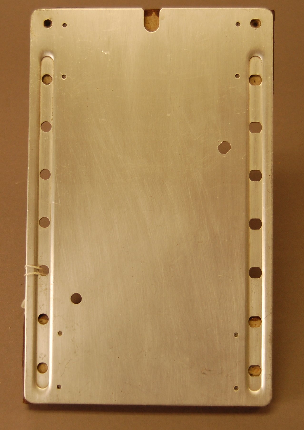 - Interlining braille slate board with groove and seven holes for slate pins on both sides, holes for removable paper clamp at top; bright aluminum top, thick fiber board pads underneath.
