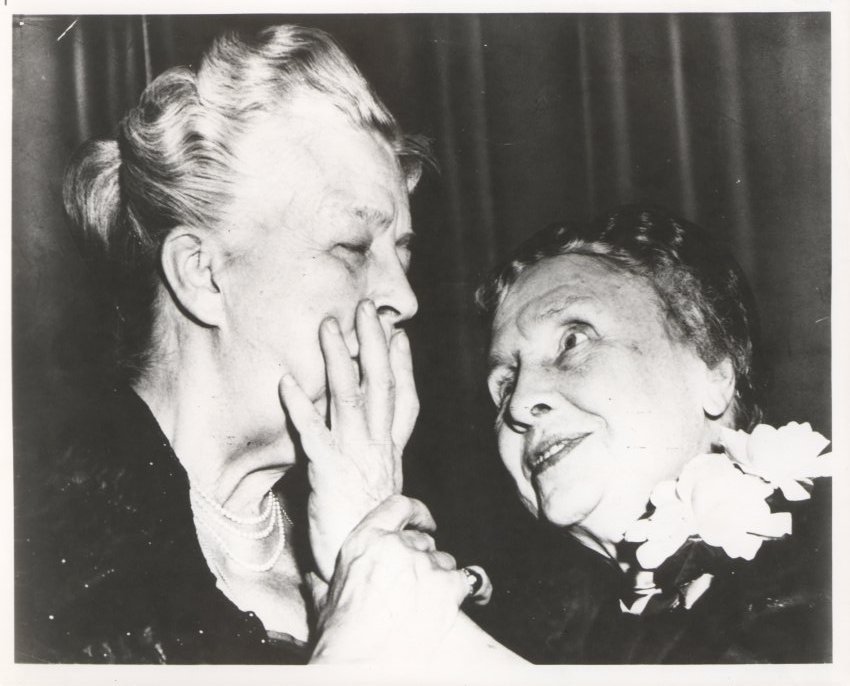 - BW print; close-up of head and shoulders of Eleanor Roosevelt and Helen Keller; Keller is reading Roosevelt's lips with her left hand and Roosevelt holds Keller's wrist with her right hand; both are smiling; Roosevelt's eyes are closes, Keller's eyes look intently up at Roosevelt; Roosevelt is wearing an evening dress and pearls, and Keller is wearing a fur jacket with a corsage attached; dark curtain visible behind them.