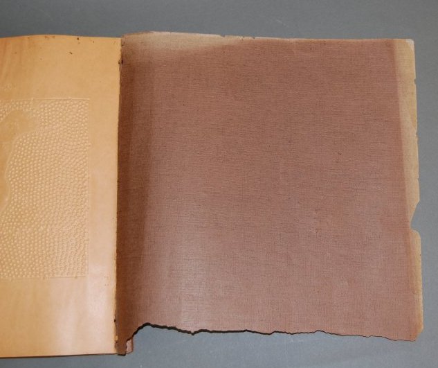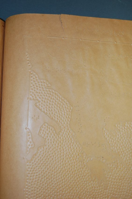 - Atlas is bound in a plain, dark-brown paper cover and contains twenty-four maps, each single-side embossed on a single sheet (14 x 13.5 in.) of light brown paper. Landmasses are smooth and outlined in a continuous line of small raised dots; water areas are filled with a pattern of larger concave dots; and cities are indicated by a single raised dot. Each map has a braille title at top center of page; a braille number at top left or at bottom left, near binding edge; and braille labeling (cities are abbreviated) on both smooth and textured surfaces. Except for the first four maps, each is "framed" within a raised-line border that has evenly spaced single dots to mark longitude and latitude. Titles of maps (translated): 1. North Pole 2. Western Hemisphere 3. Eastern Hemisphere 4. South Pole 5. Europe 6. Denmark 7. Finland 8. Central Europe 9. British Isles 10. France 11. Netherlands/Belgium 12. Switzerland 13. Iberian Peninsula 14. Apennine Peninsula 15. Balkan Peninsula 16. Southwest Asia 17. Southeast Asia 18. Asia 19. Palestine 20. Africa 21. South Africa 22. Australia 23. South America 24. North America