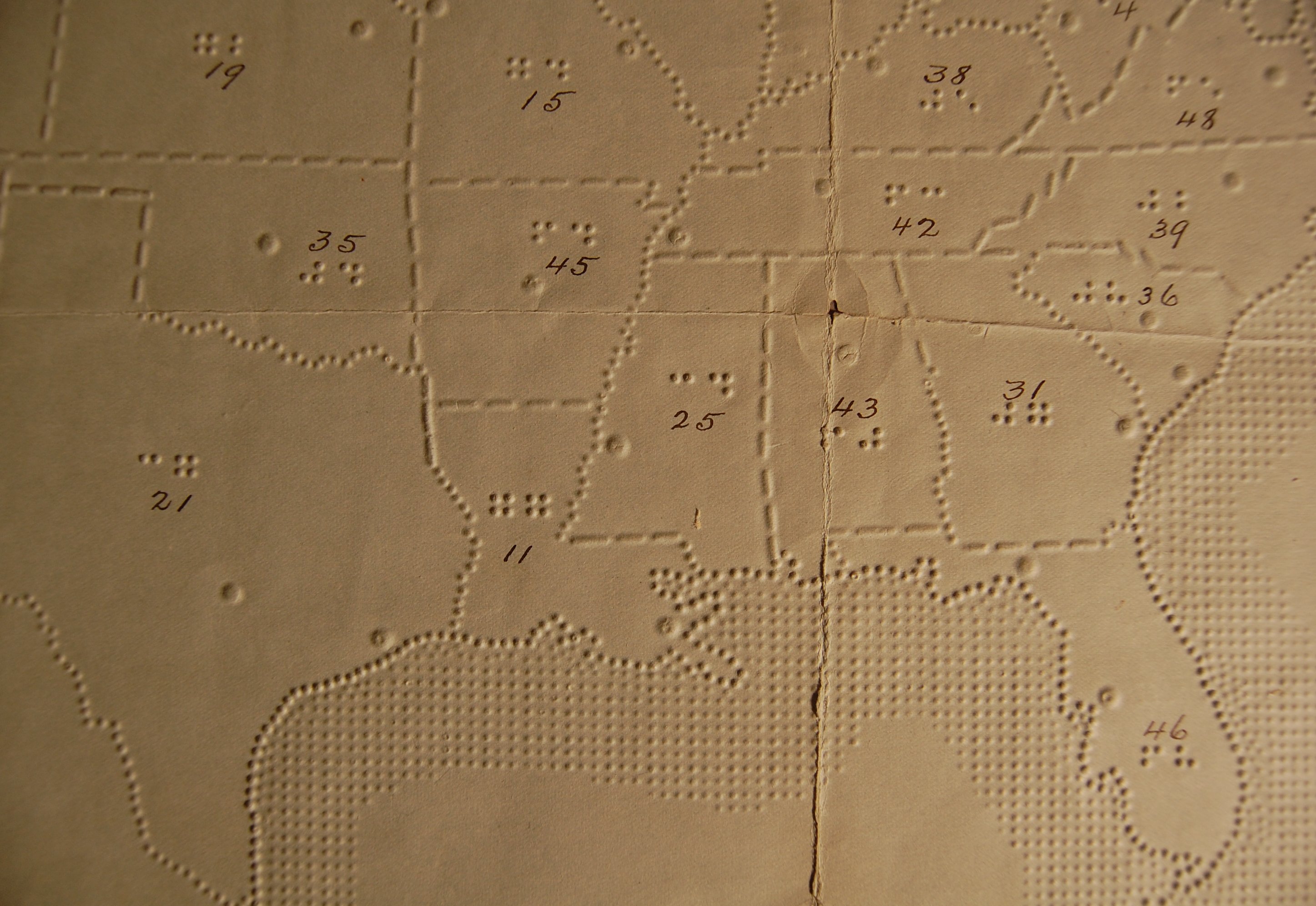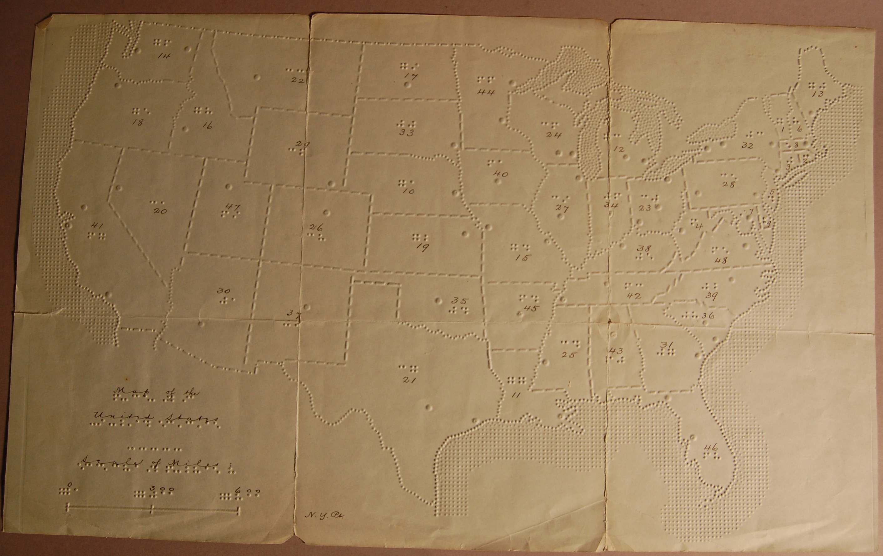 - Map includes a scale of miles and New York point labeling; each state is numbered. Print equivalent is also handwritten in ink. Raised dots indicate capitals and major cities. Embossed on grayish-blue paper. Tears along fold lines and bottom left corner.
