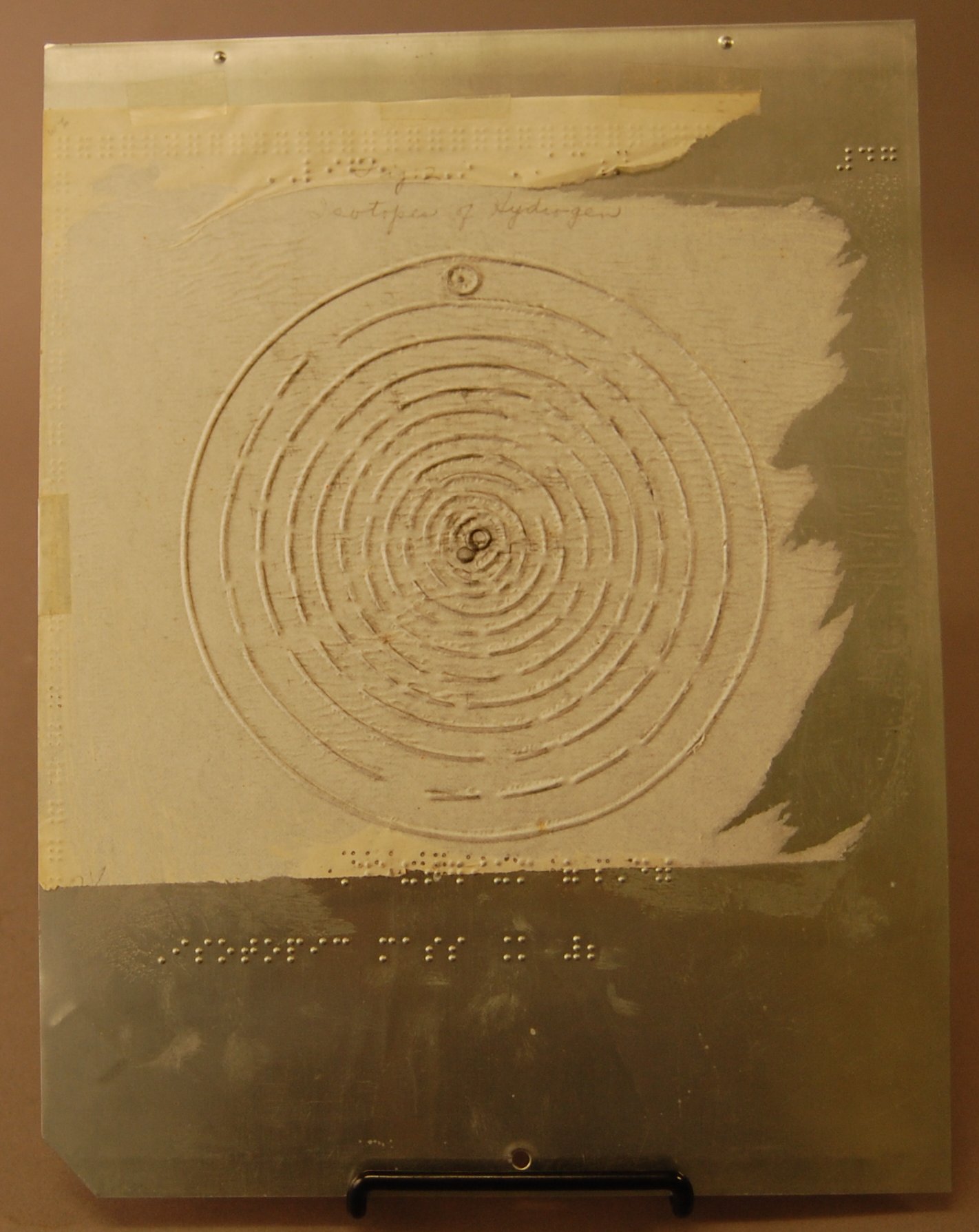 - Embossing plate used to produce a tactile illustration on paper. Part of original drawing (paper pattern) used to create illustration on plate remains glued on plate front. Braille title on plate: "Fig. 2 Isotopes of Hydrogen."