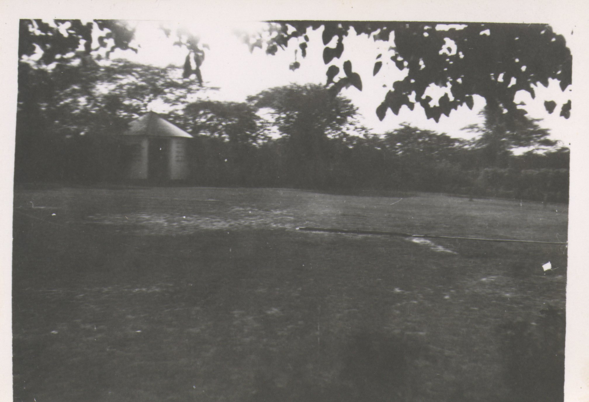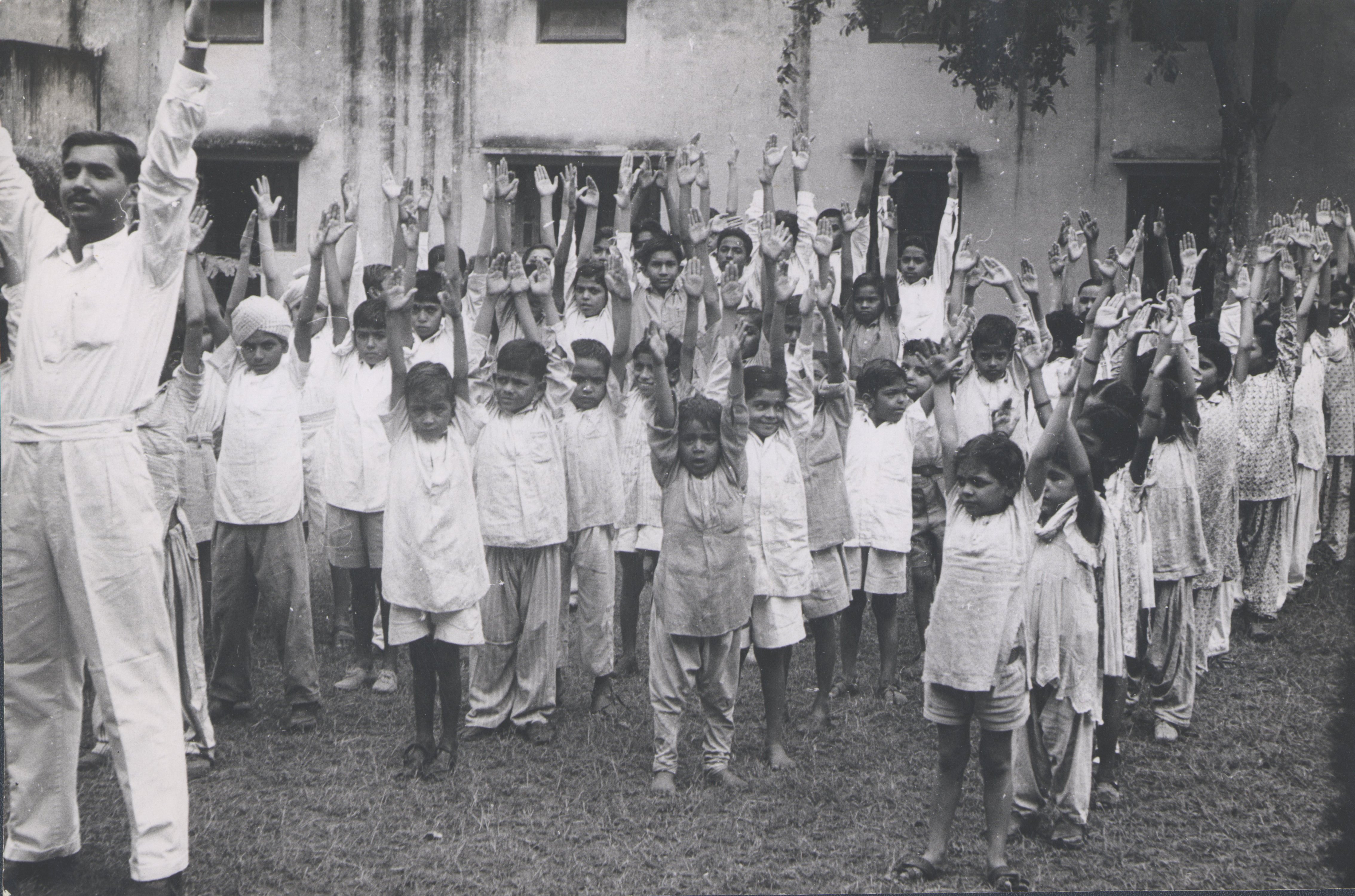 - BW prints; .724: Indian man in white shirt and pants, K.P. Gupta, stands with his hands stretched above his hands at left; four lines of children behind him stand on a grass lawn in a similar pose; cationed on back, "Mr. K.P. Gupta, teacher, taking a P.T. Class, 3/11/48"; stamped "Copyright Indian News Chronicle, Delhi"; 5 x 7.625"; .725: Indian man in shirt and tie, K.P. Gupta, sits in an armchair, his hands holding the hands of a small boy in white standing facing him; captioned "Mr. K.P. Gupta teaching articulation to a student; 8.125 x 6"; .726: Field with trees and small building with conical roof in background; captioned Playground. Presented to Dr. Milton T. Stauffer, K.P. Gupta 4-2-49"; 2.5 x 3.5"; .727: Courtyard and school building featuring tile roof, columned arcade; tree leaves overhead; 2.5 x 3.5";