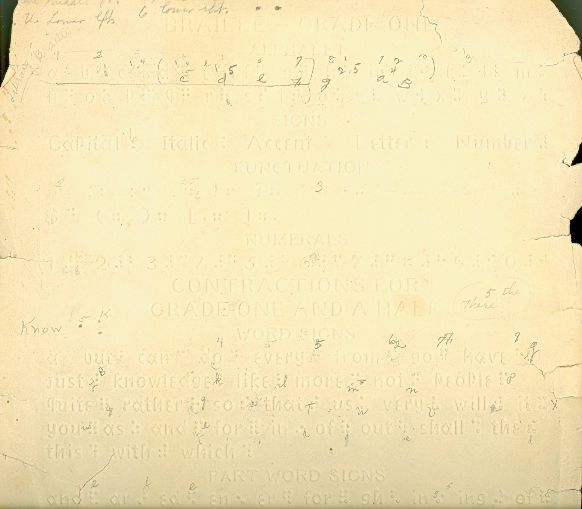 - Three embossed, grade 1 braille alphabet sheets, with contractions for grade 1 1/2 braille. Cards provide the alphabet; signs (capital, italic, accent , letter, number); and punctuation. Print equivalents are also embossed in line letter on the sheets, and section headings are in line letter. One card (.2) has handwritten notes in pencil.