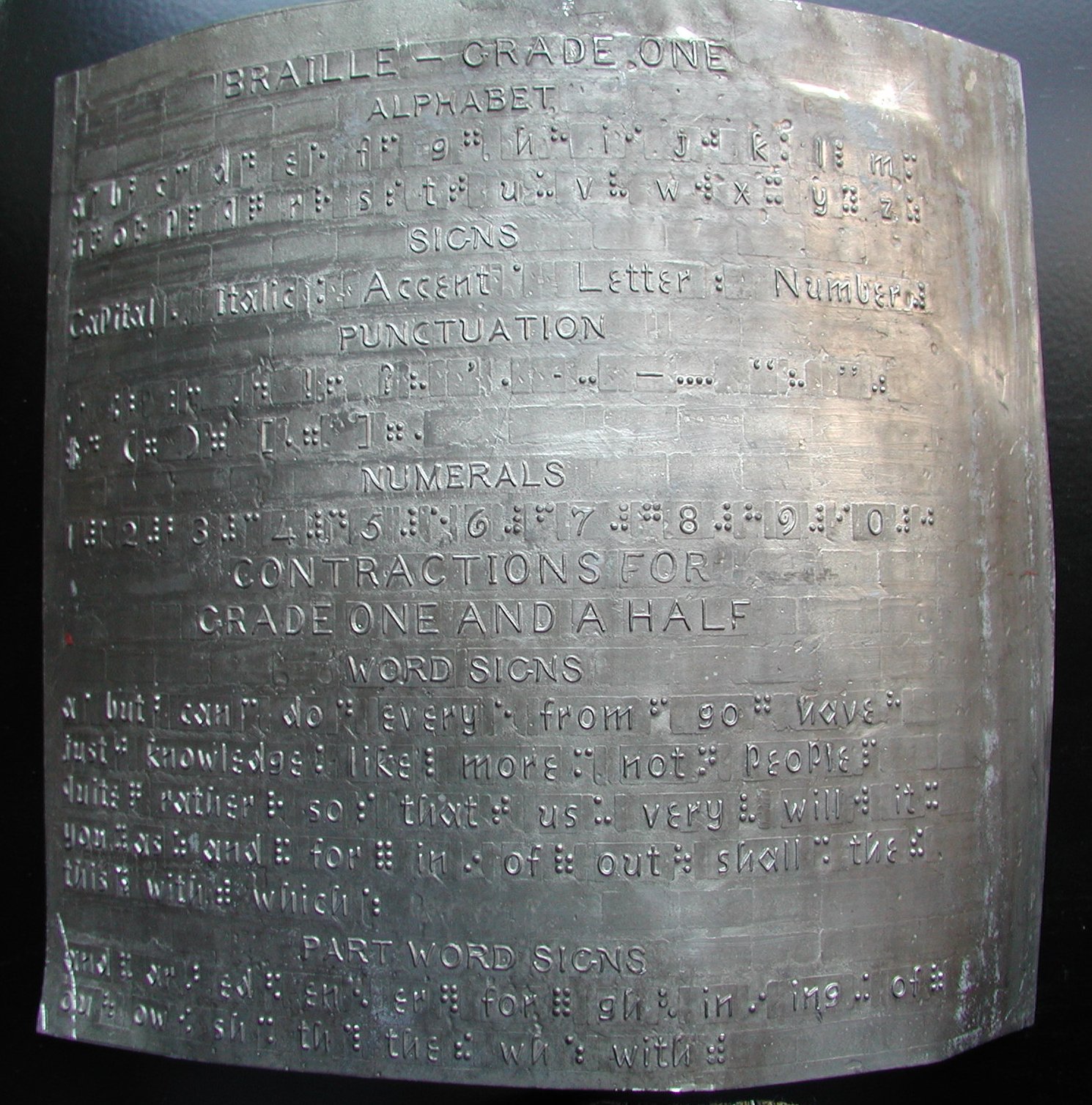 - 4 embossing plates, produced from hand set type pressed into foil and mounted on a sheet of tinplate; (a) Braille Grade One alphabet, signs, punctuation, and numbers and Grade 1 1/2 word signs and part word signs.