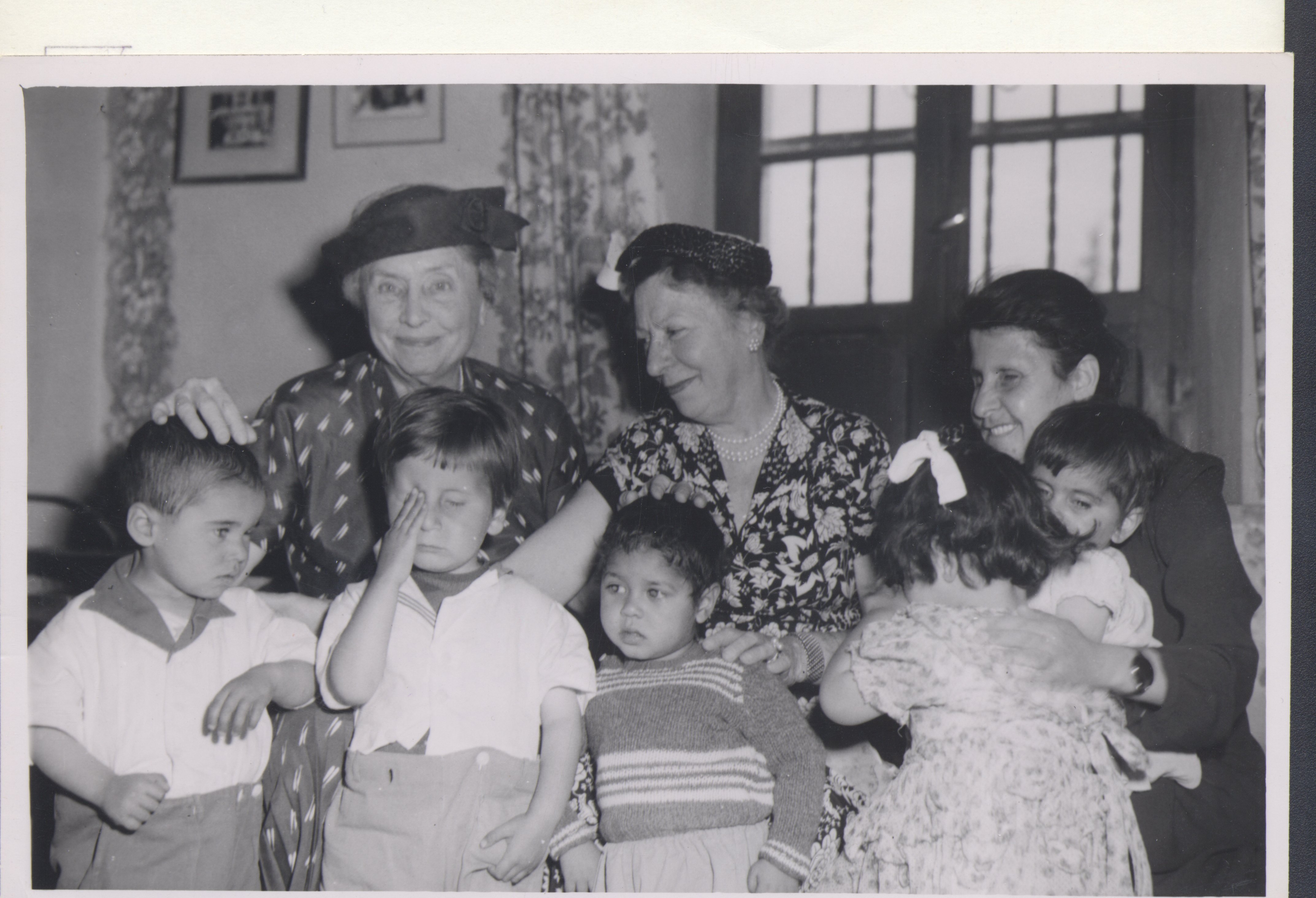 - BW print; Left to Right, Helen Keller, Polly Thomson, and Adele Dafesh smile and sit with five small children gathered in front of them to face the camera; one little boy wipes an eye; Kellers hand is on top of the head of one boy; Dafesh holds a small boy on her lap and a girl on the right appears to be trying to climb up as well.