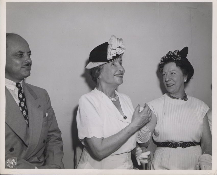 - BW print; left to right, Nelson Neff, Helen Keller, Polly Thompson; Keller wears a white dress with a V neckline, pearls, and a triangular black hat with a light lining and a large white bow; Thomson wears a white dress with spotted dark belt, white gloves, a braided gold choker, and a dark hat with striped trim; Thompson is fingerspellling into Keller's hand, who looks upward and smiles broadly; captioned "Miss Helen Keller speaks to thousands of Japanese School Girls and Boys at the Emperor's Palace Plaza, Tokyo"; stamped "Official Signal Corps Photo".