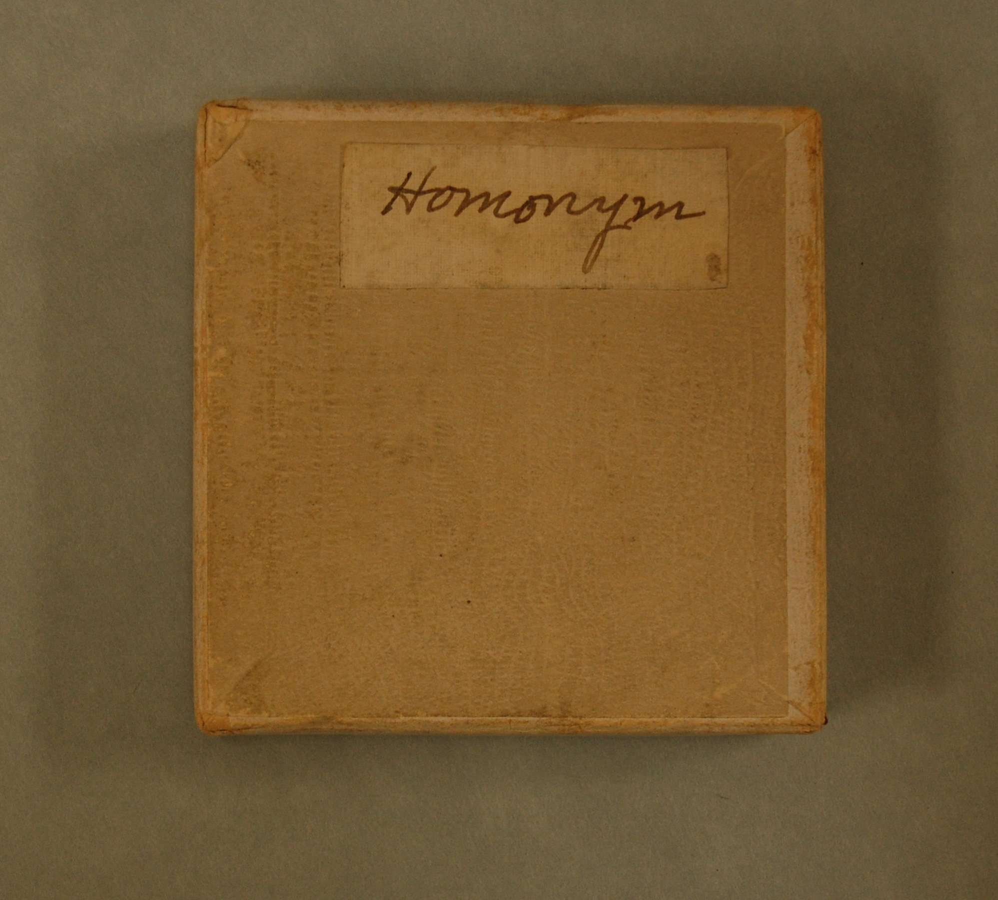 - Thirteen lightweight wooden squares in original white cardboard box. Each square has a single letter stamped in black ink on the front and reverse. Raised brass dots provide the braille equivalent on one side only. The letters that are represented in both print and braille are C, E, N, S, and T. The letter F appears on the opposite side of all but one square that instead has the letter J. The letters F and J have been scribbled over with red crayon or pencil. A label with the word "Homonym" handwritten in ink is attached to the top of the box lid. "3 Words" is handwritten on the inside of the lid. The squares can be arranged to create the homonyms "sent", "cent", and "scent".