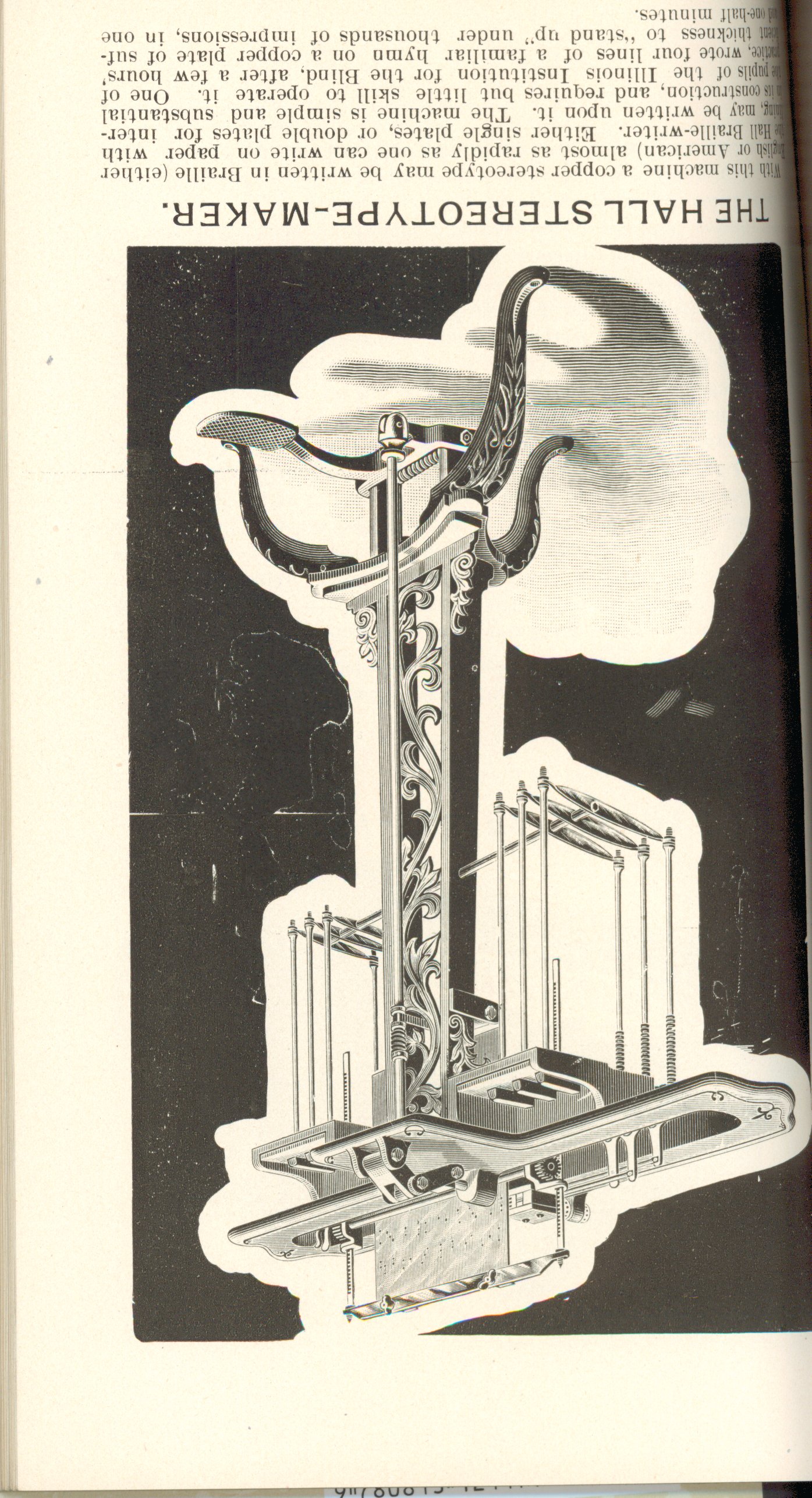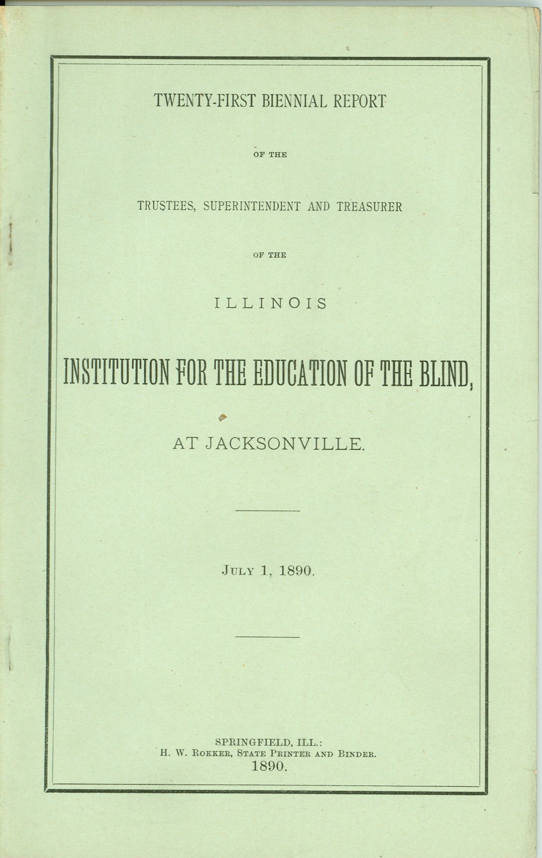- Holdings: 1851-1890/1892, 1894/1896, 1900/1902-1914/1916. Printed reports document the school's management, building, and student activities. School officers, staff, and students are listed. Financial receipts and disbursements and some black-and-white photo illustrations are included. An engraving of the school building appears in the 4th biennial report and in several subsequent reports. The 21st and subsequent reports include illustrations of the Hall Braille Writer and the Stereotype Machine. Title varies: Annual Report of . . . Illinois Institution for the Education of the Blind (issued January 1851). Biennial Report. . . Illinois Institution for the Education of the Blind (1853/1855). Biennial Report of . . . Illinois School for the Blind (1906/1908).