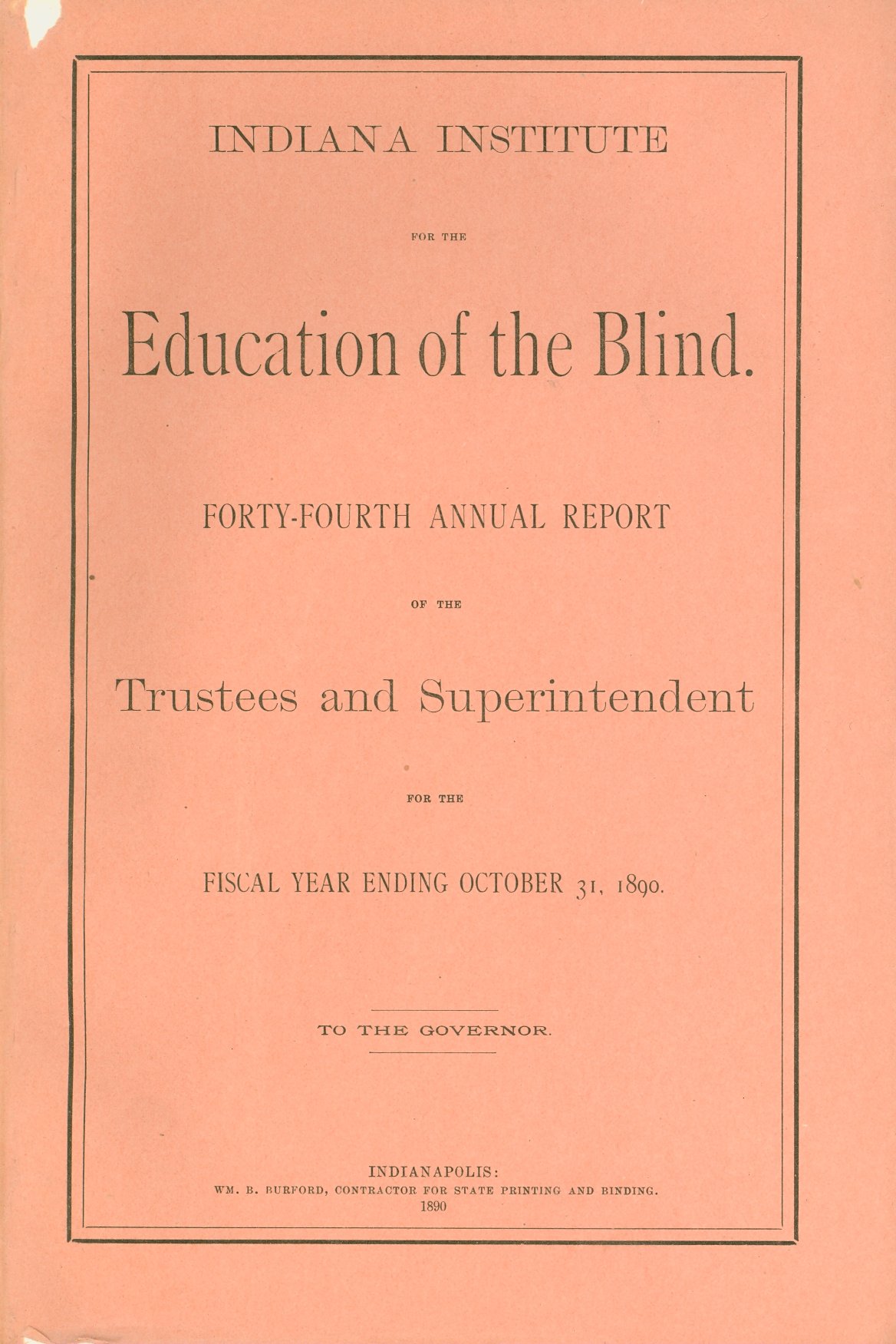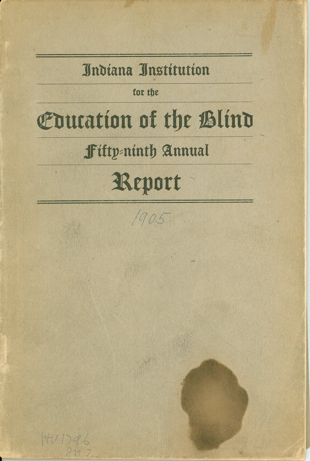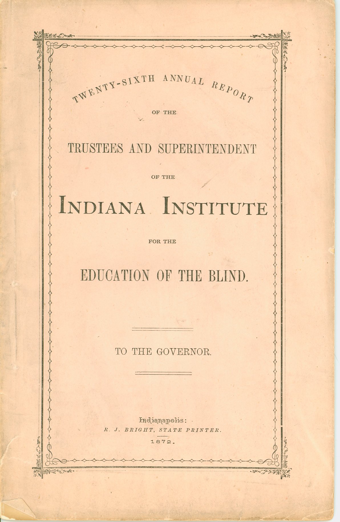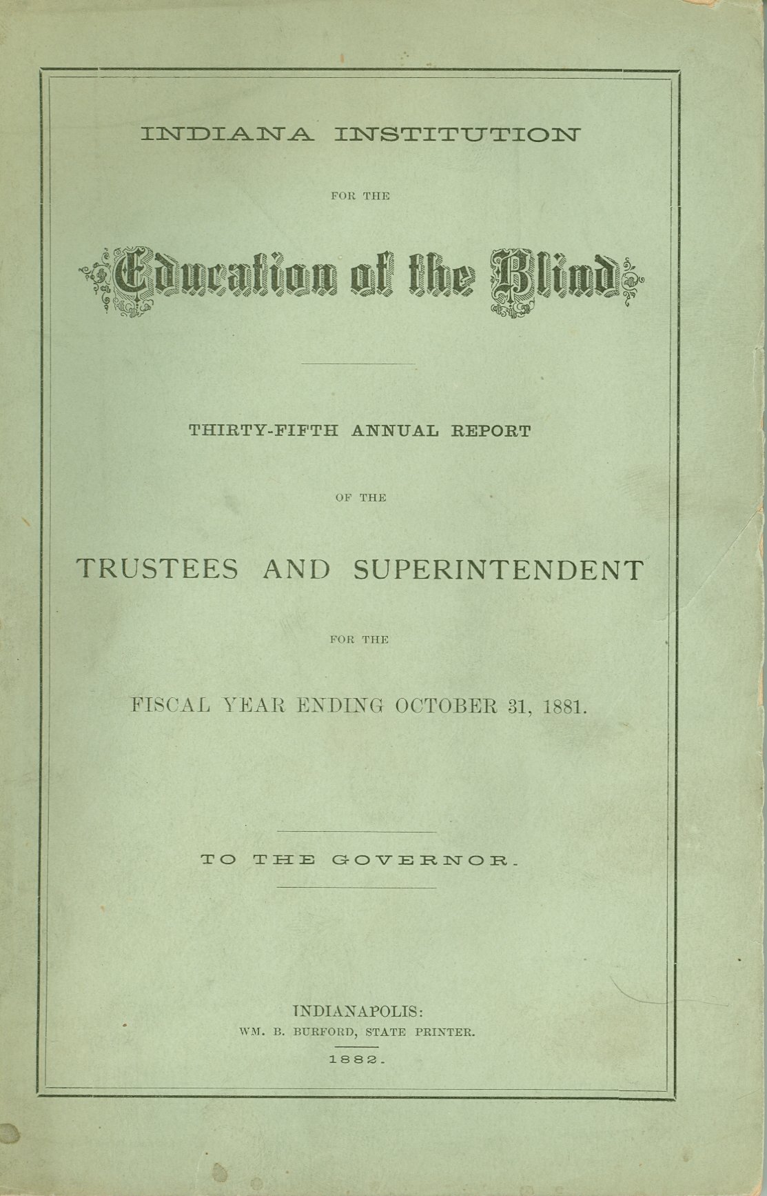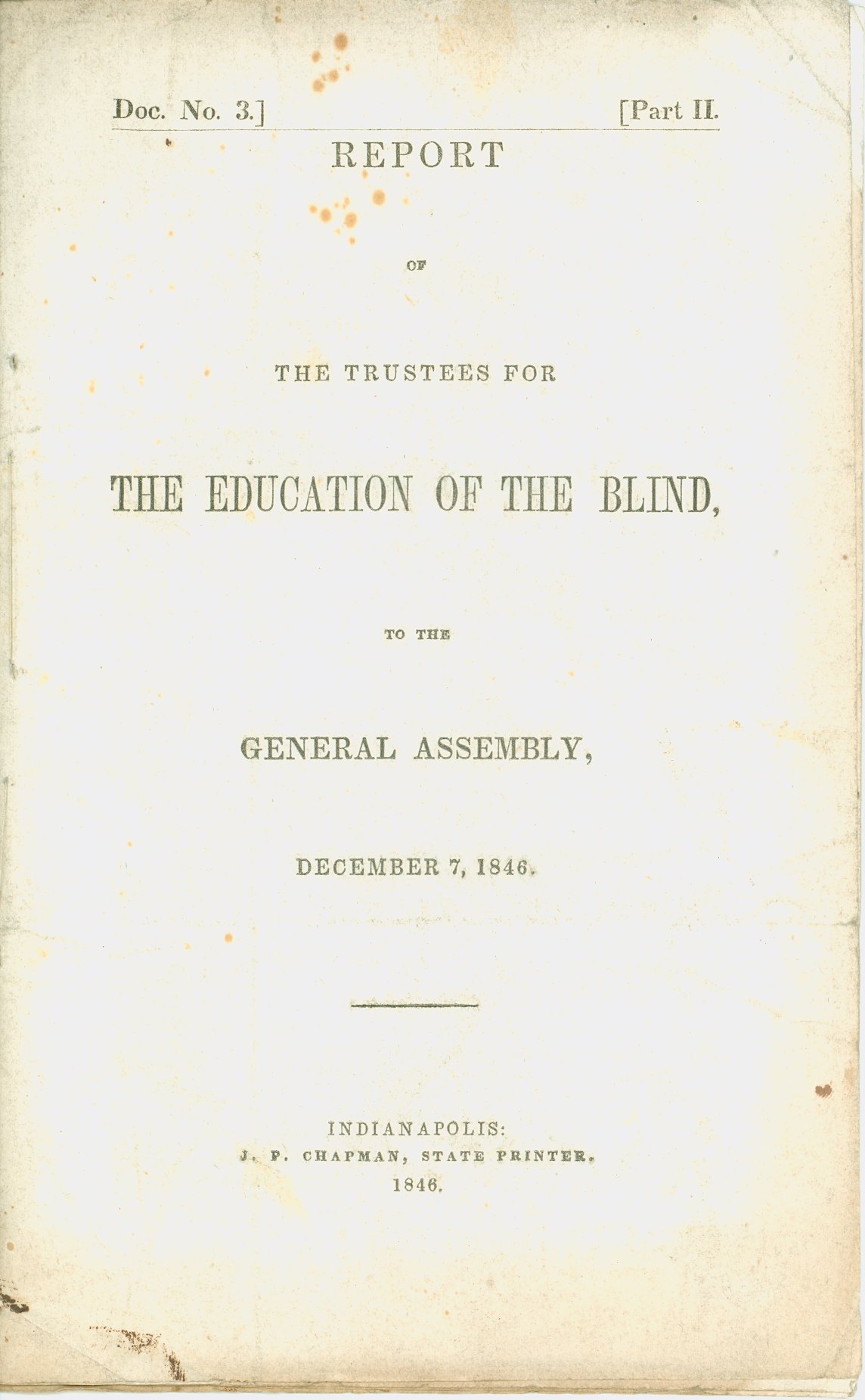 - Holdings of annual reports: 1846 (Report of the Trustees to the General Assembly), 1847 (1st)-1854, 1857, 1859-1868, 1870-1883, 1886, 1888-1915, 1917-1948, 1952, 1954, 1967. Title varies: Annual Report . . . of the Indiana Institute for the Education of the Blind (1847). Annual Report of the . . . Indiana Institution for the Education of the Blind (1898). Annual Report of the . . . Indiana School for the Blind (1907). Printed reports document the school's management, building, and student activities, and list the school's officers and staff. Financial information is included. Students are listed up through the 1954 report. Some reports include black-and-white photo illustrations. Tipped-in specimen of raised line letter 1st and 2nd reports, and of embossed sheet music in the 4th report. Frontispiece of school building "Designed & Drawn by F. Costigan" in the 4th annual report and in several subsequent reports. Illustrations of building floor plans appear in 22nd report. Also included: a separate 13-page article issued in the Indiana Journal Extra, July 28, 1853; the "Report of W.H.H. Terrell, Financial Secretary to the Governor, May 1864" regarding sufficient funds to keep "benevolent institutions" of Indiana open; and the Enrolled Act, No. 112, originating in the Indiana House of Representatives and passed by the state's General Assembly in 1879, which relates in part to the Indiana school.