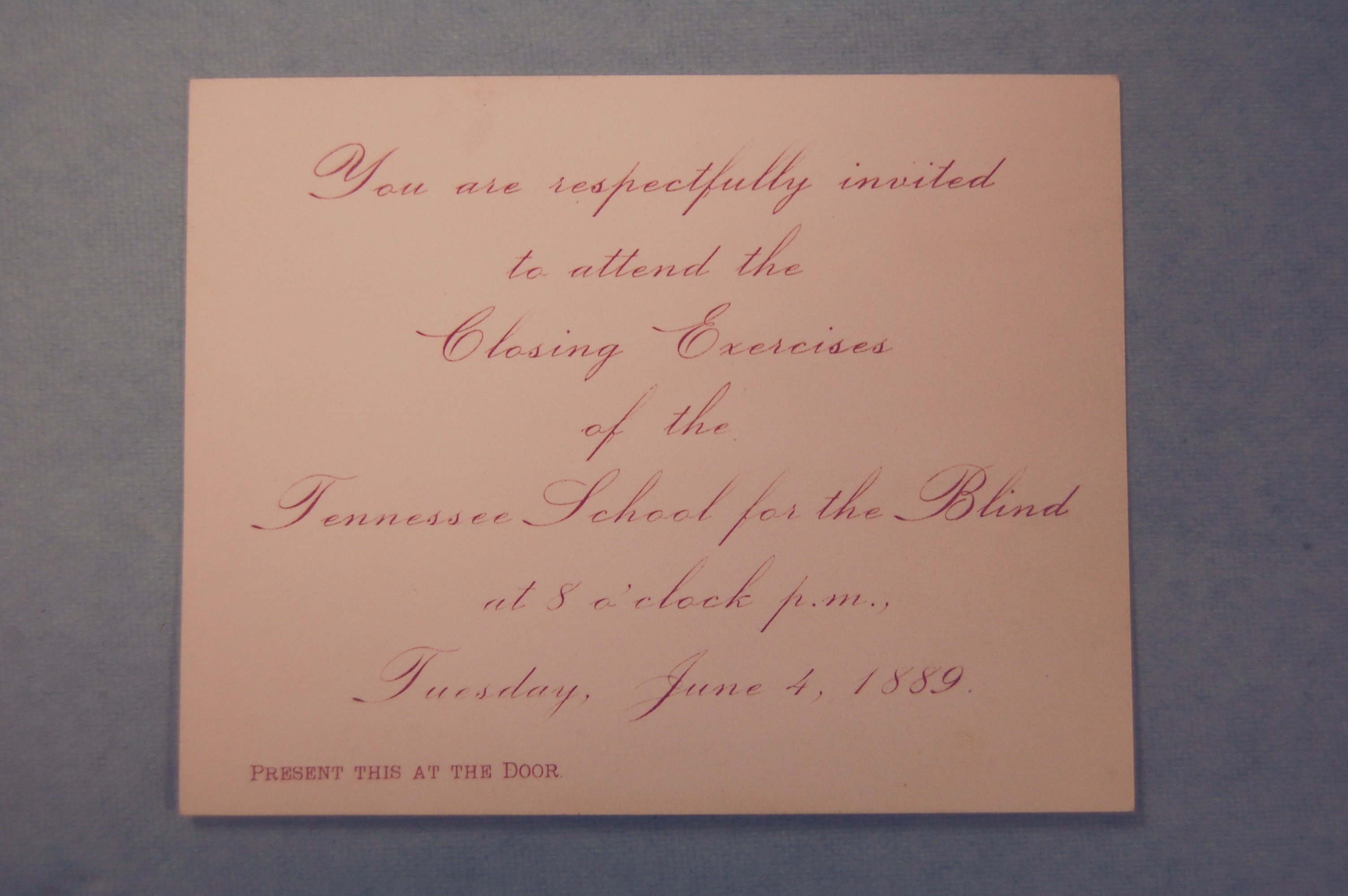 - Ink-print invitation reads "You are respectfully invited to attend the Closing Exercises of the Tennessee School for the Blind at 8 o'clock p.m., Tuesday, June 4, 1889." At bottom left corner is printed "Present this at the Door." Reverse is blank.