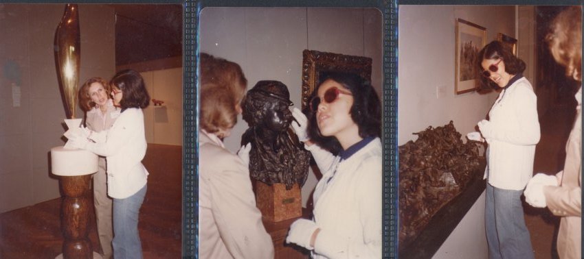 - Three color snapshots of Kozue Kusayama, a student at Japan International Christian University, exploring sculpture by touch, wearing white gloves and guided by a woman also wearing white gloves; apparently in a museum with western art similar to Frederick Remington.