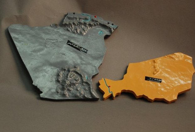 - Easel-type dissected relief map of Africa; pieces formed from two layers, a molded epoxy relief layer adhered to a foundation layer of epoxy board, cut to shape after gluing as revealed by the band saw lines on the sides; dissected countries lift out of a recessed outline frame with black trim; main bodies of water are depressed from landmasses and are enameled blue; mountains are raised; countries are enameled in green, gold, pink, gray, and sand; national and regional capital cities are indicated by pointed red tack heads; other cities are rounded tack heads; braille Dymo tape labeling; all pieces stamped on reverse, "#1".