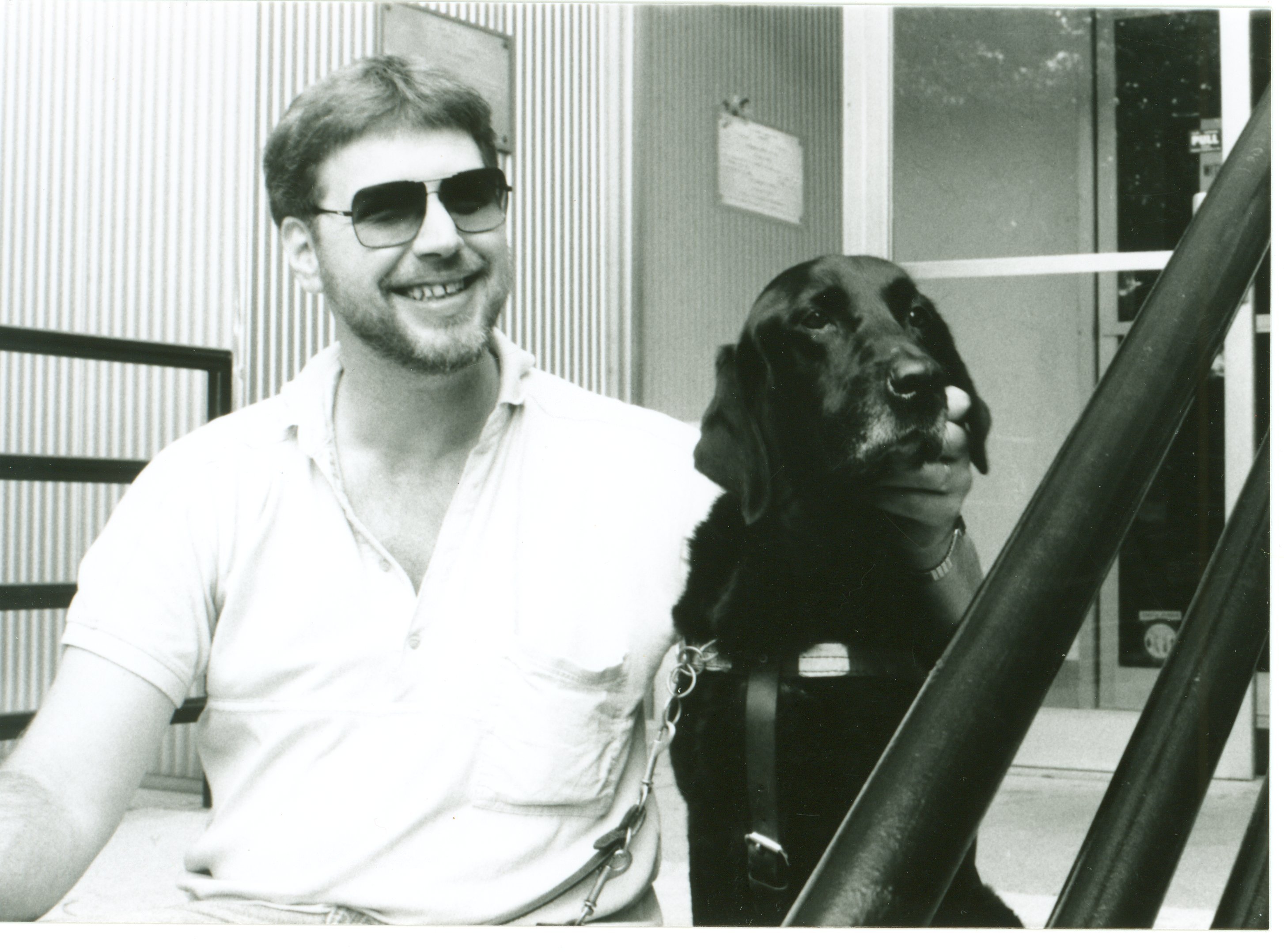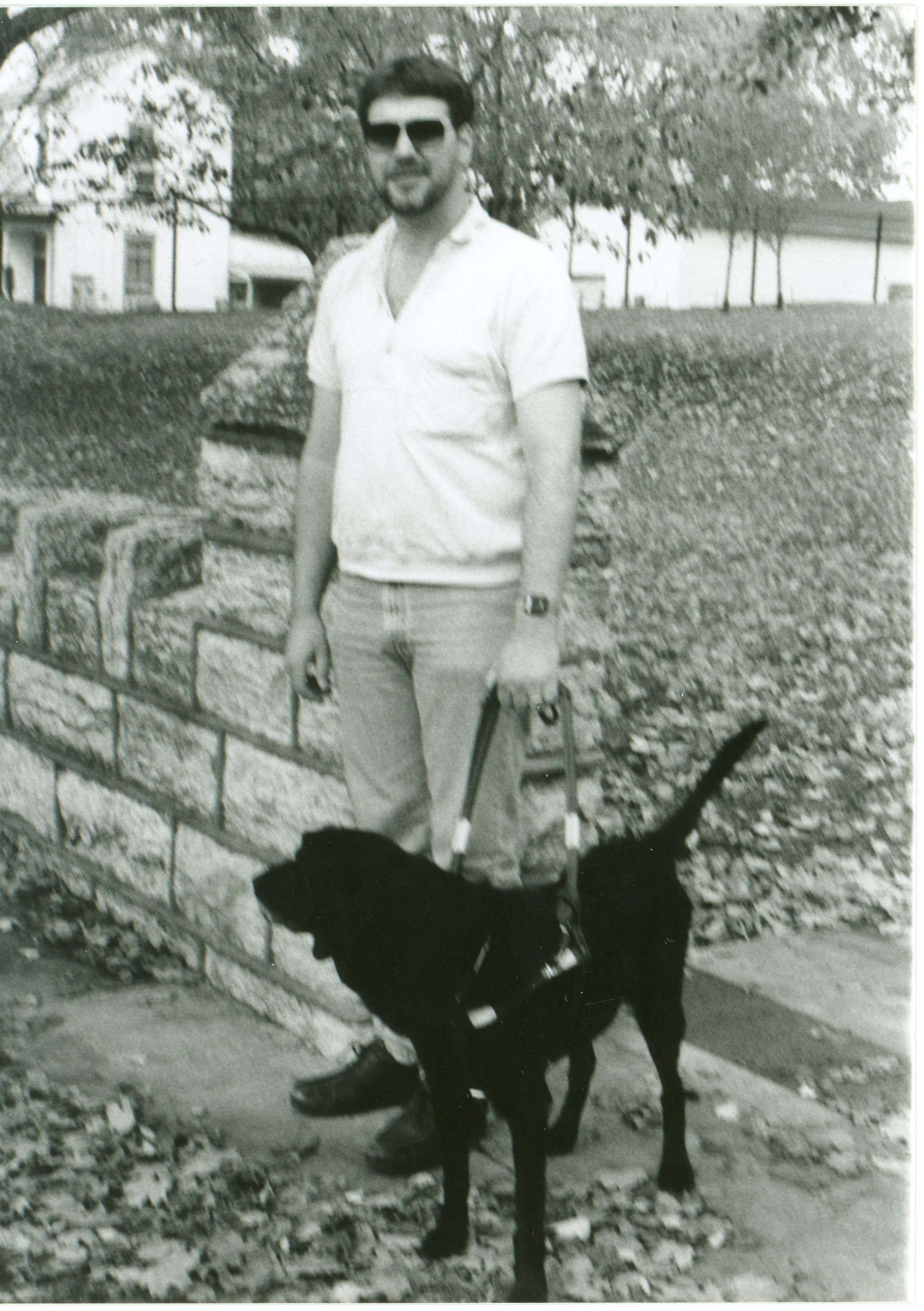 - Twenty black-and-white glossy photographs showing different views of Larry Skutchan, Technology Project Leader at APH, with his dog guide George, outside the front entrance of the American Printing House for the Blind (APH), seated on front steps and standing on front sidewalk adjacent to Frankfort Avenue. Negatives on file.