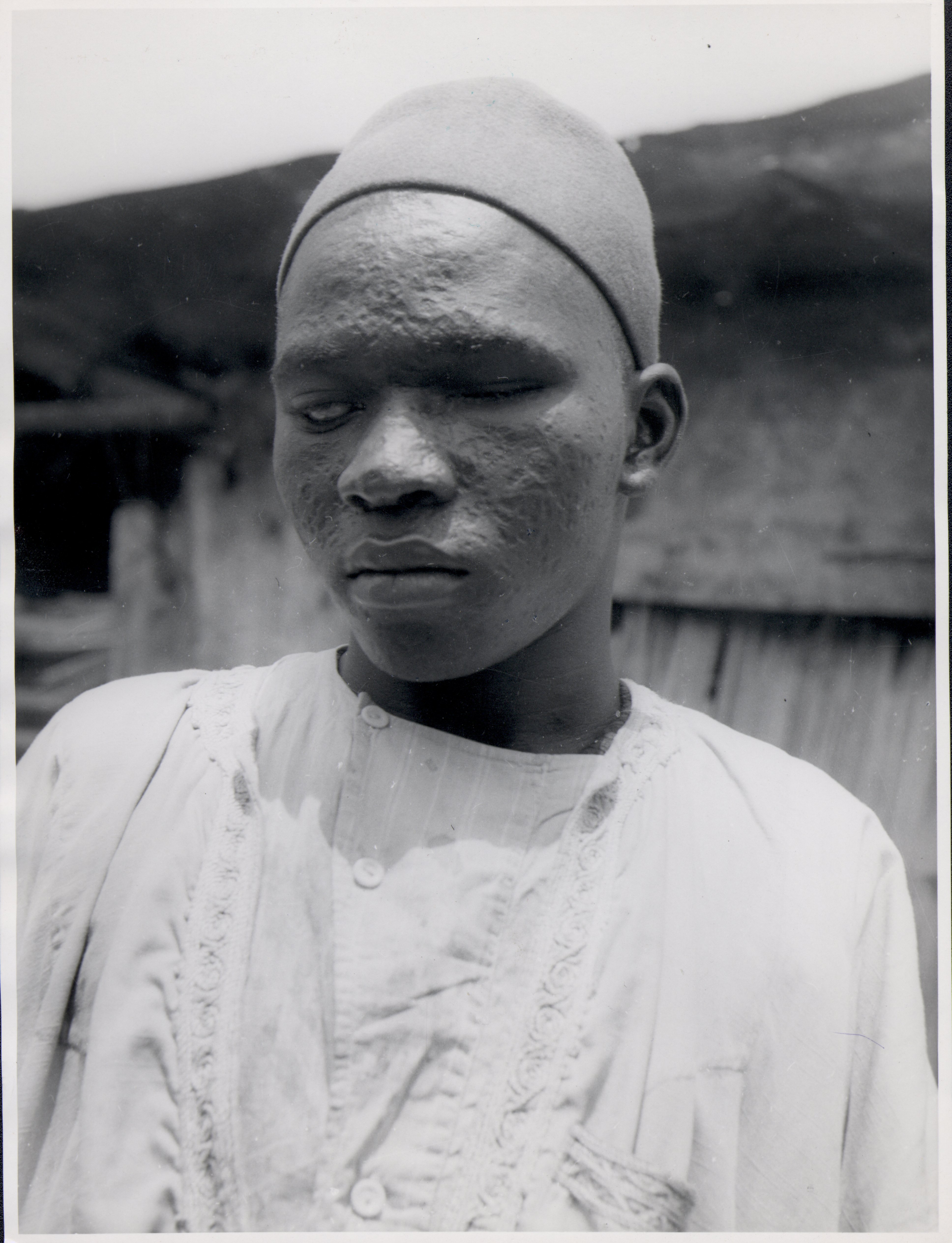 - BW print; man wearing felt cap, dark skin, his face heavily scarred and eyes closed; wearing a light shirt with a button front and lace trim; a wooden structure in the background; stamped "British Empire Society for the Blind"; captioned "A young man of Abari Court, a quarter of Lagos, Nigeria; this part of the town is inhabited mainly by blind beggars".