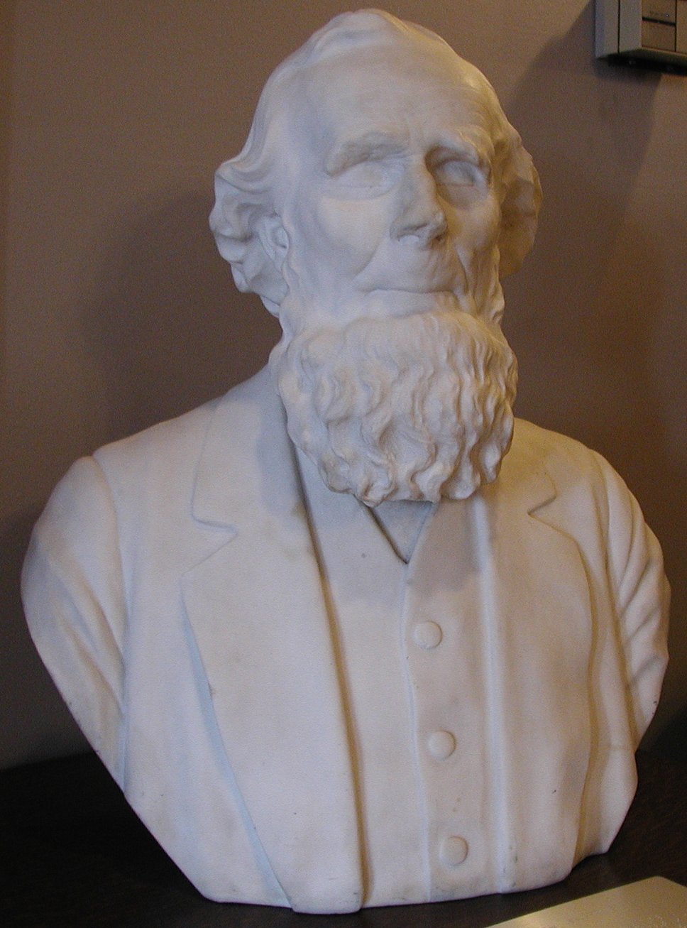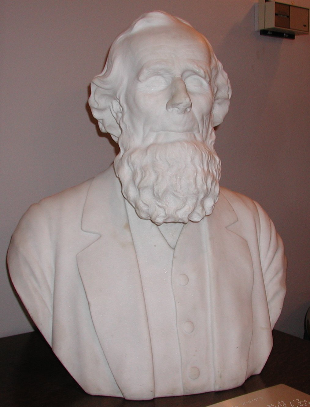 - White marble bust of a bearded, elderly man in a jacket and vest; heavy overhanging brows over closed eyelids; signed and dated "A. O'Connor Sc. 1898."
