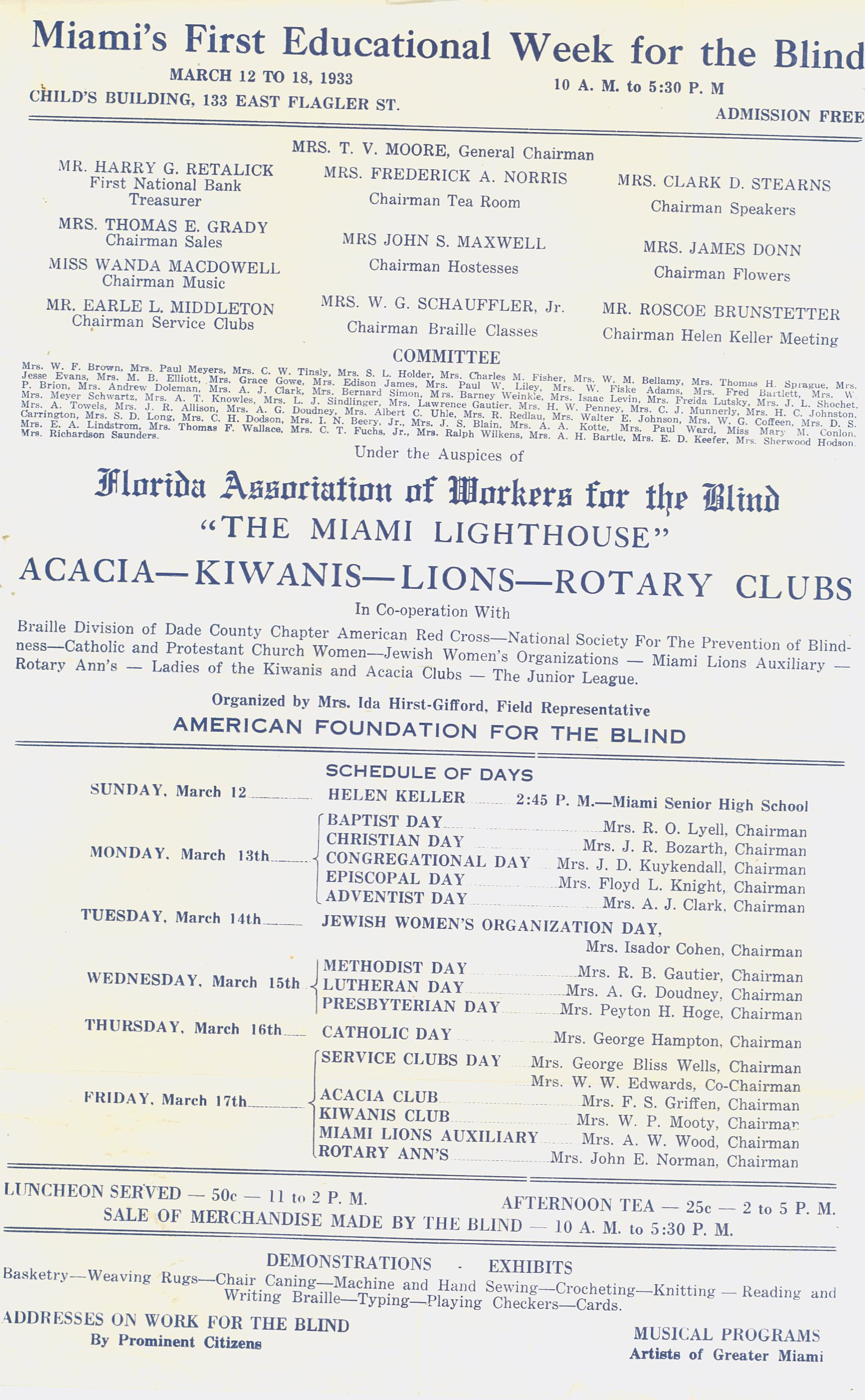 - Printed flier advertising the first "Educational Week for the Blind" in Miami. Held at the Child's Building in cooperation with the Florida Association of Workers for the Blind, also known as the Miami Lighthouse, and other local agencies. Event featured speaker Helen Keller and "Addresses on Work for the Blind by Prominent Citizens." Admission was free.
