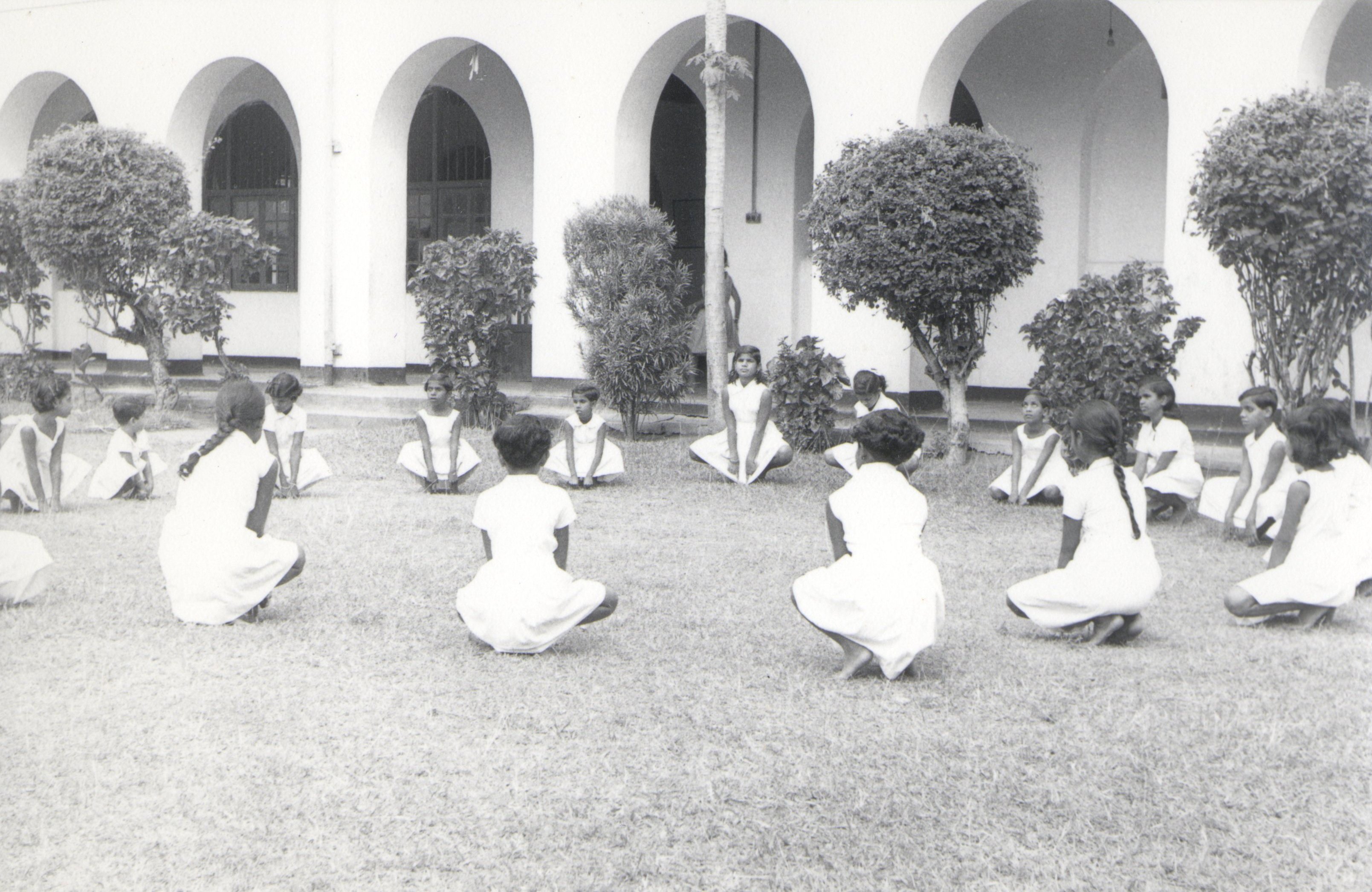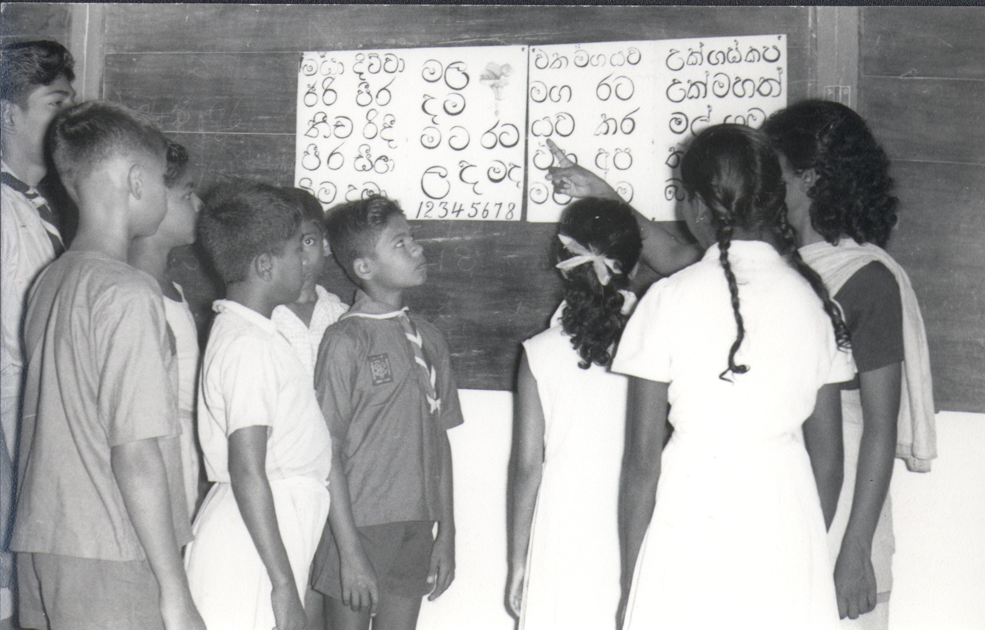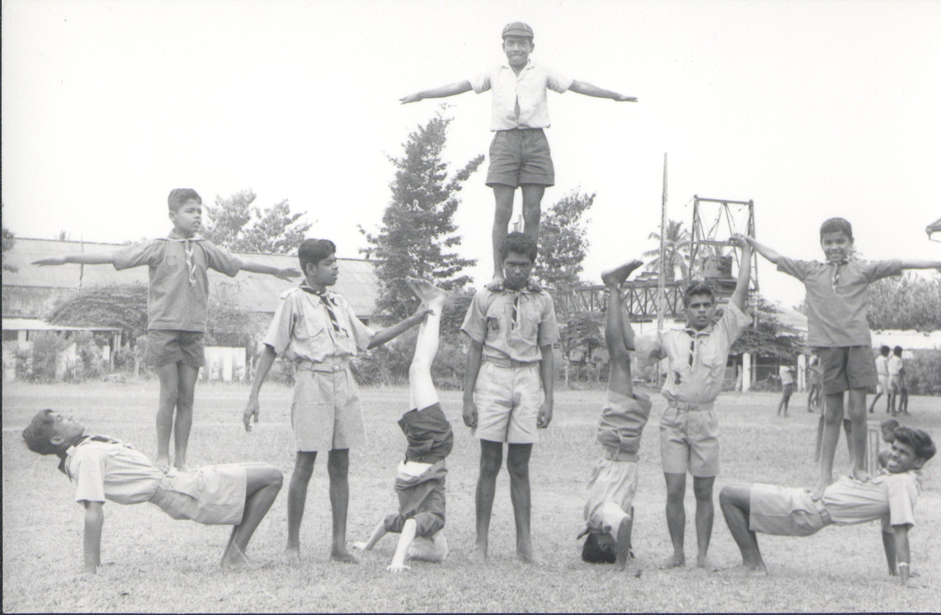 - (8) Eight BW prints; .778: Sri Lankan students gathered around chalk board and teacher pointing to large print teaching chart; captioned "Reading lesson in the partially sighted class"; .779: Sri Lankan boy playing piano; captioned "Practising for the Junior Grade Exam of the Trinity College of Music, London"; .780: Two Sri Lankan boys and a girl gather around an anatomical mannequin as a teacher holds a removed muscle from the form; captioned "A physiology lesson in the Junior Class"; .781: Four Sri Lankan girls in white dresses with cumberbunds kneel, their hands out in front; a flower lays on the floor in front of each dancer; their hair is pulled back in a tight bun on top of their heads; captioned "an oriental dance for the Junior girls"; .782: Two Sri Lankan boys sit playing wooden flutes; they wear placketed shirts decorated with patch on breasts; captioned "Two accomplished flutists"; .783: Sri Lankan girls in white dresses crouch in a large circle on a grassy lawn in front of the school building; captioned "The Brownies (JUnior Guides) in action"; .784: A group of Sri Lankan boys in a circle with one hand on the shoulder of the boy ahead and the other hand extended in a fist, wearing uniform shirts, shorts, beanie caps, and neckerchiefs; captioned "The cubs practising a dance for a camp fire"; .785: Ten Sri Lankan boys in scout uniforms (shorts, shirts, and neckerchiefs) forming a human pyramid on a grassy playground.