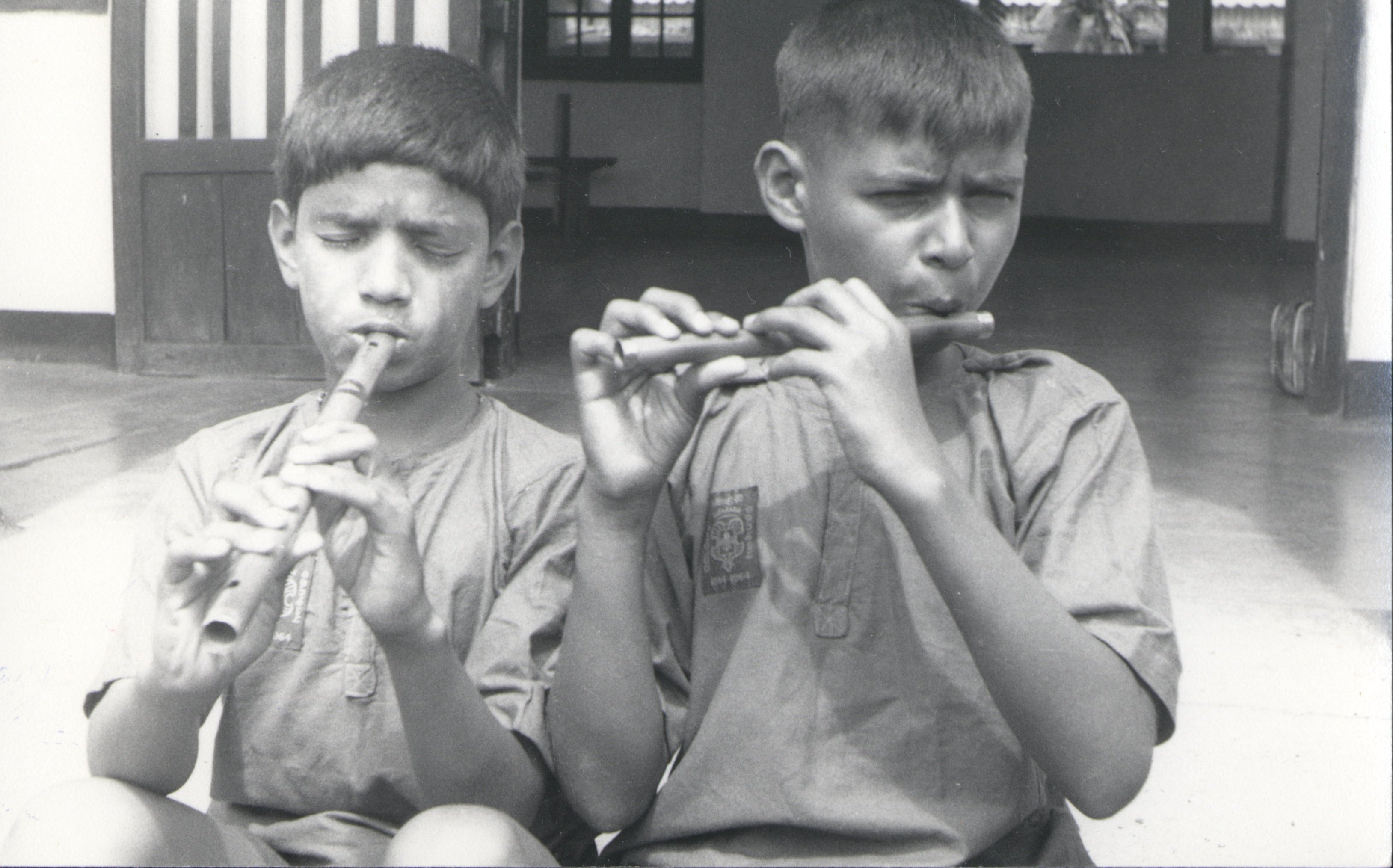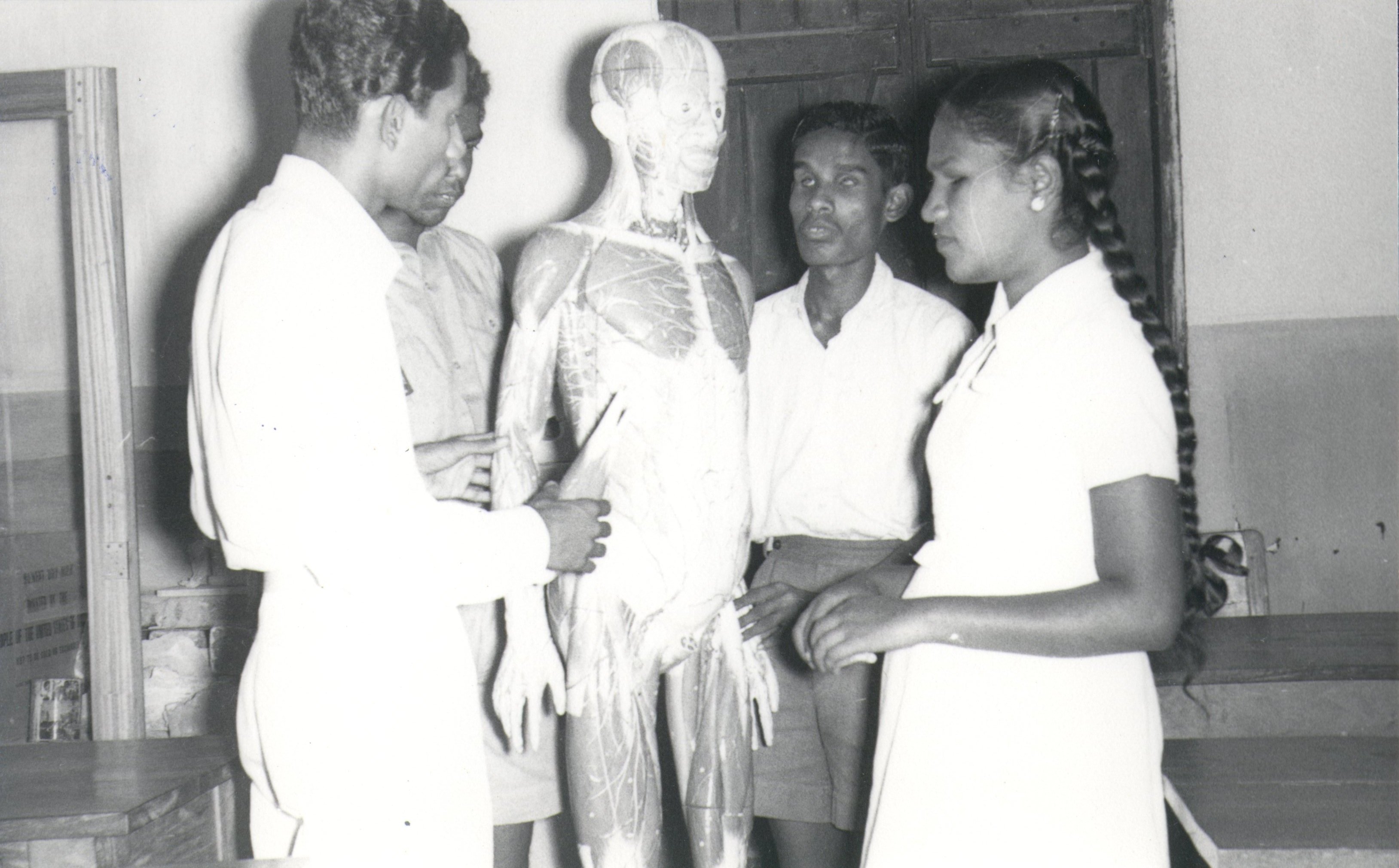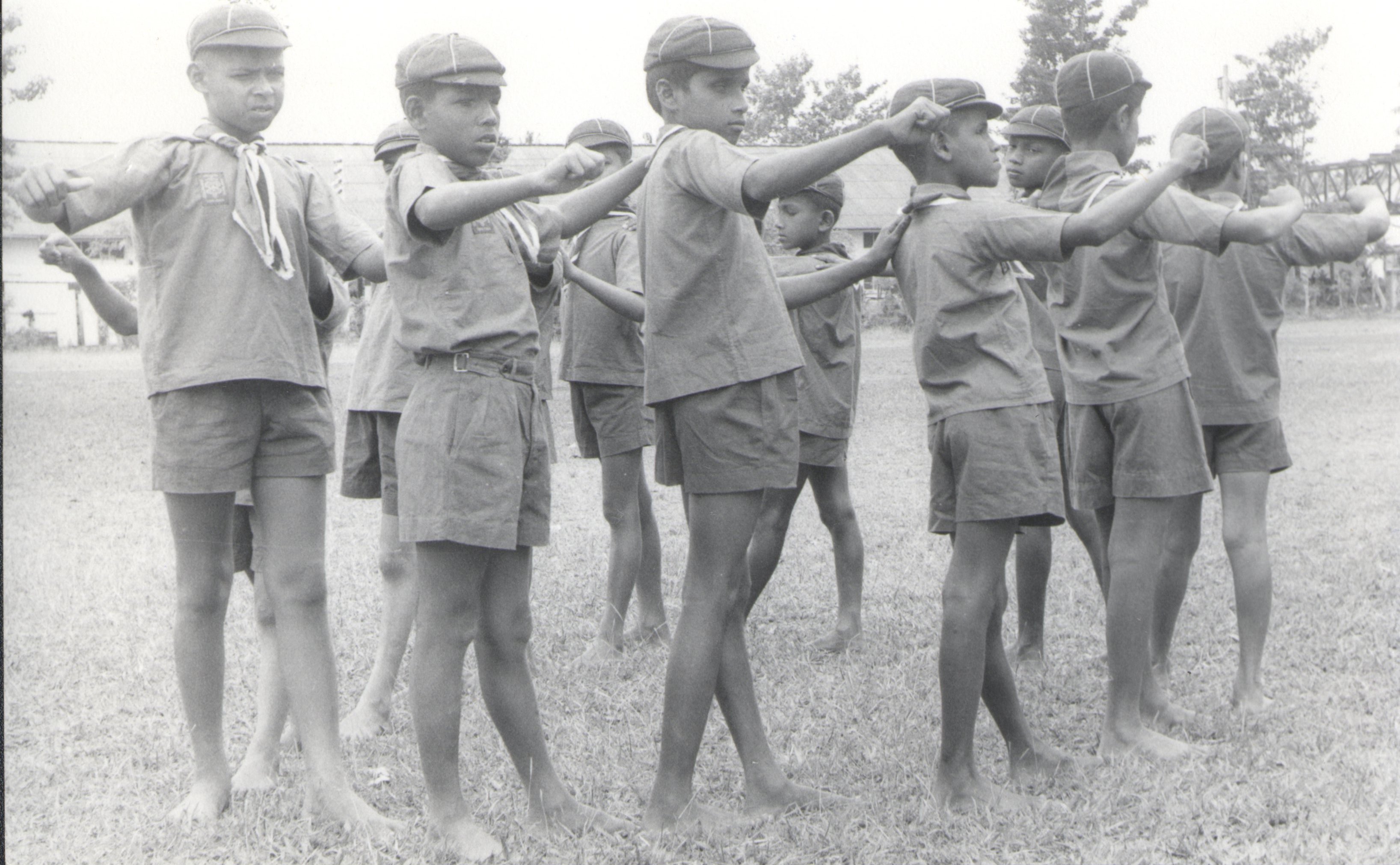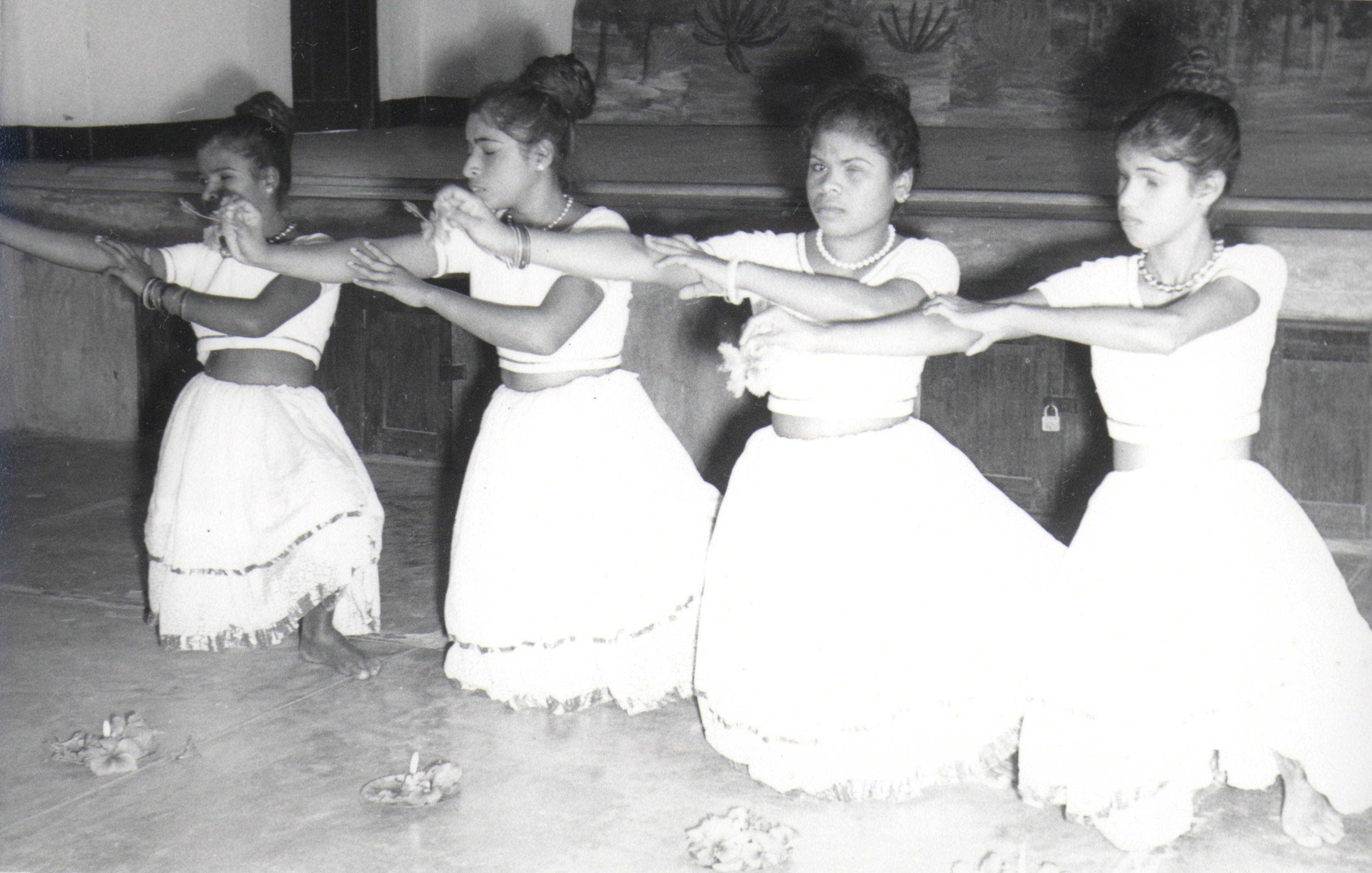 - (8) Eight BW prints; .778: Sri Lankan students gathered around chalk board and teacher pointing to large print teaching chart; captioned "Reading lesson in the partially sighted class"; .779: Sri Lankan boy playing piano; captioned "Practising for the Junior Grade Exam of the Trinity College of Music, London"; .780: Two Sri Lankan boys and a girl gather around an anatomical mannequin as a teacher holds a removed muscle from the form; captioned "A physiology lesson in the Junior Class"; .781: Four Sri Lankan girls in white dresses with cumberbunds kneel, their hands out in front; a flower lays on the floor in front of each dancer; their hair is pulled back in a tight bun on top of their heads; captioned "an oriental dance for the Junior girls"; .782: Two Sri Lankan boys sit playing wooden flutes; they wear placketed shirts decorated with patch on breasts; captioned "Two accomplished flutists"; .783: Sri Lankan girls in white dresses crouch in a large circle on a grassy lawn in front of the school building; captioned "The Brownies (JUnior Guides) in action"; .784: A group of Sri Lankan boys in a circle with one hand on the shoulder of the boy ahead and the other hand extended in a fist, wearing uniform shirts, shorts, beanie caps, and neckerchiefs; captioned "The cubs practising a dance for a camp fire"; .785: Ten Sri Lankan boys in scout uniforms (shorts, shirts, and neckerchiefs) forming a human pyramid on a grassy playground.
