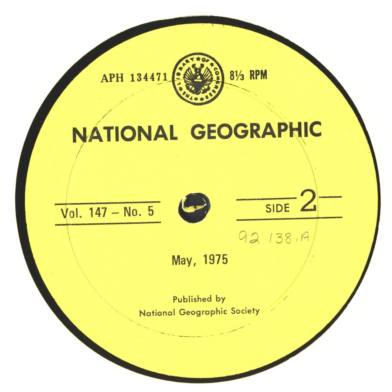 - May 1975 issue. APH 134471(ff). Recorded for The Library of Congress. Volume 147, no. 5. Reproduced from: National Geographic Society, 1975.
