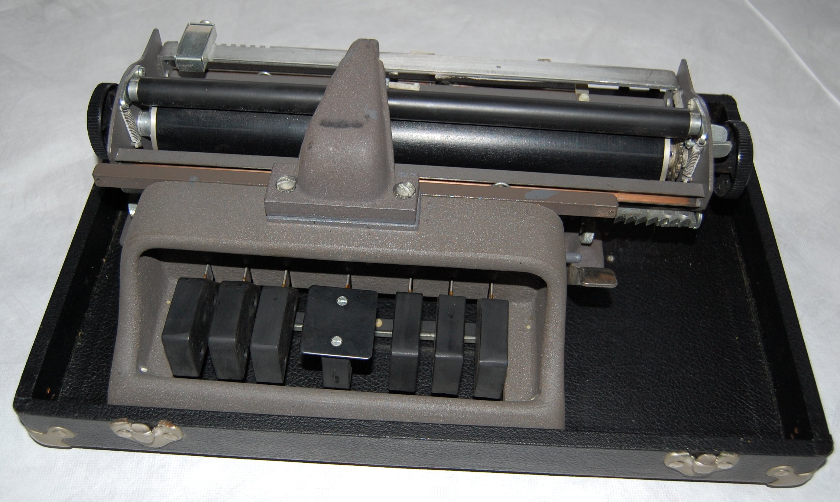 - Braille writer, which weighs 11 pounds, has a conventional keyboard with back spacing lever on the right side of the base. Paper is wrapped around a central wooden roller and held in place by a rubber traction roller. The braille writer uses 11 1/2 in. wide paper with 41 cells to the line. The plate on the back reads: "The New Hall Braillewriter, Manufactured at the American Printing House for the Blind, Serial no. 4922, Louisville, Ky." Braille writer lacks case.