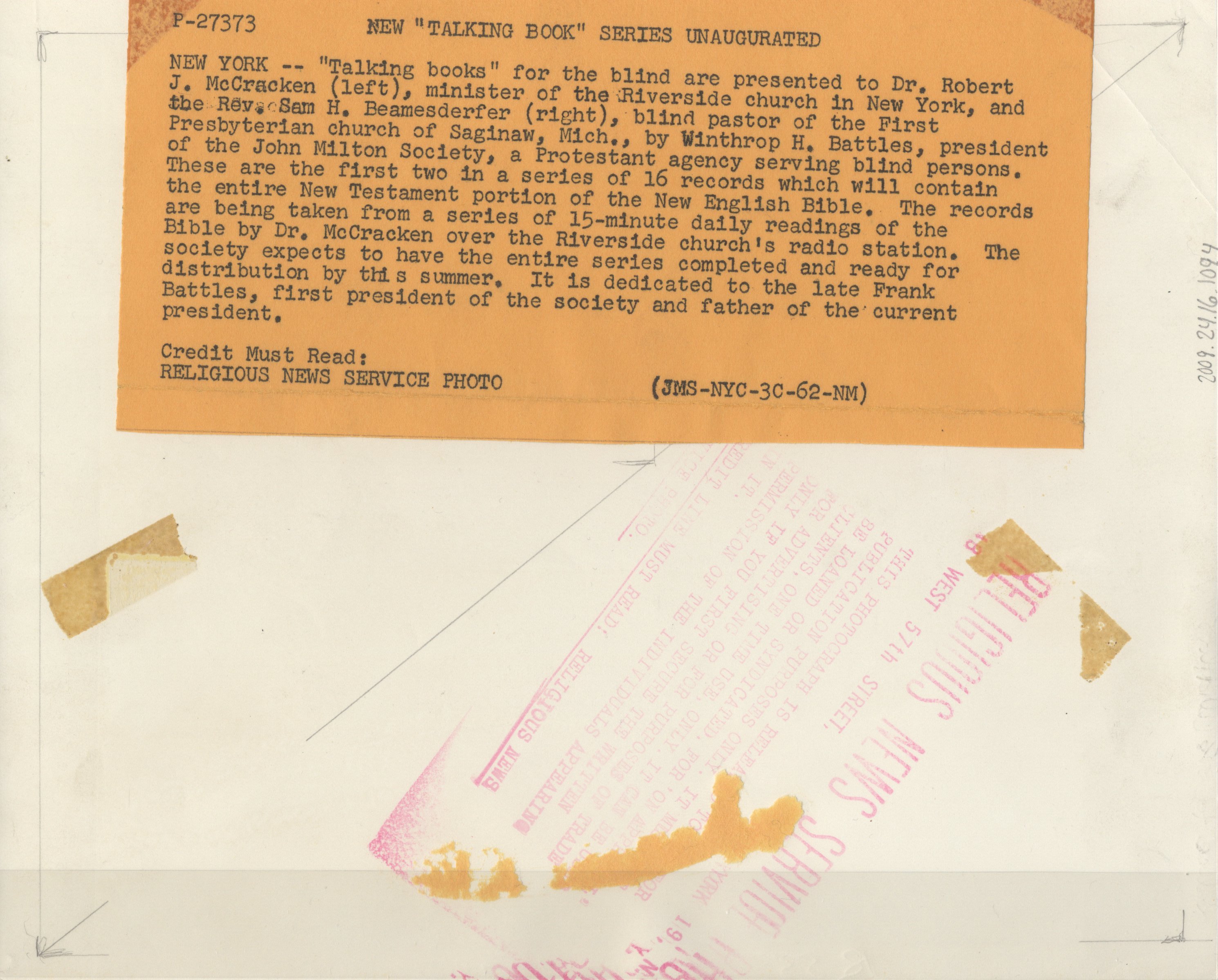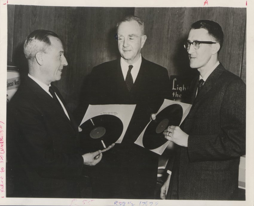 - BW print: left to right, Dr. Robert J. McCracken, Winthrop H. Battles, and Rev. Sam H. Beamesderfer, wearing dark suits and holding rigid vinyl record LPs; stamped on back, "Religious News Service Photo"; captioned "New York--Talking books for the blind are presented..."
