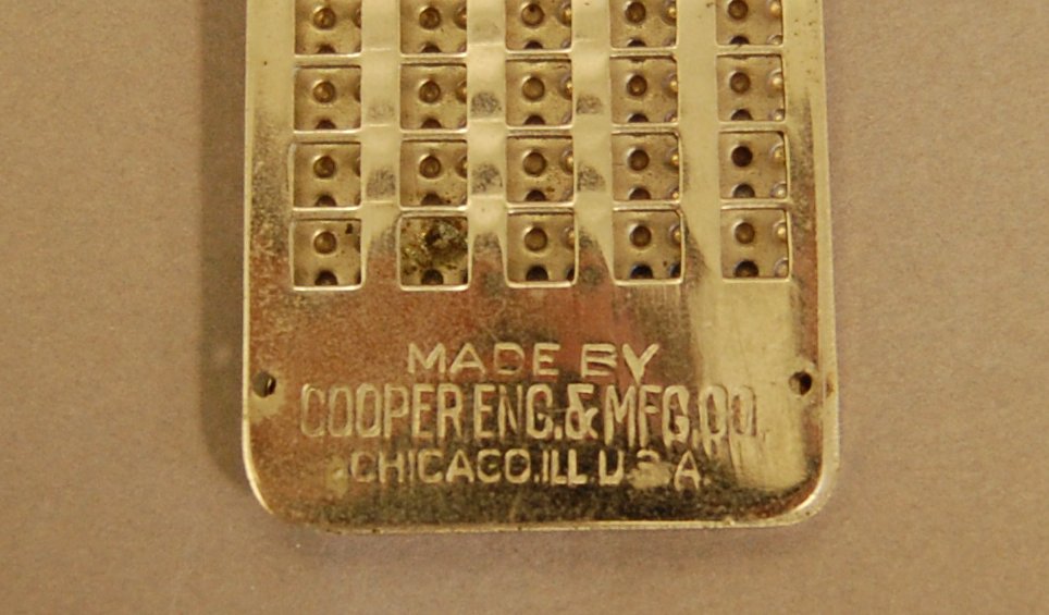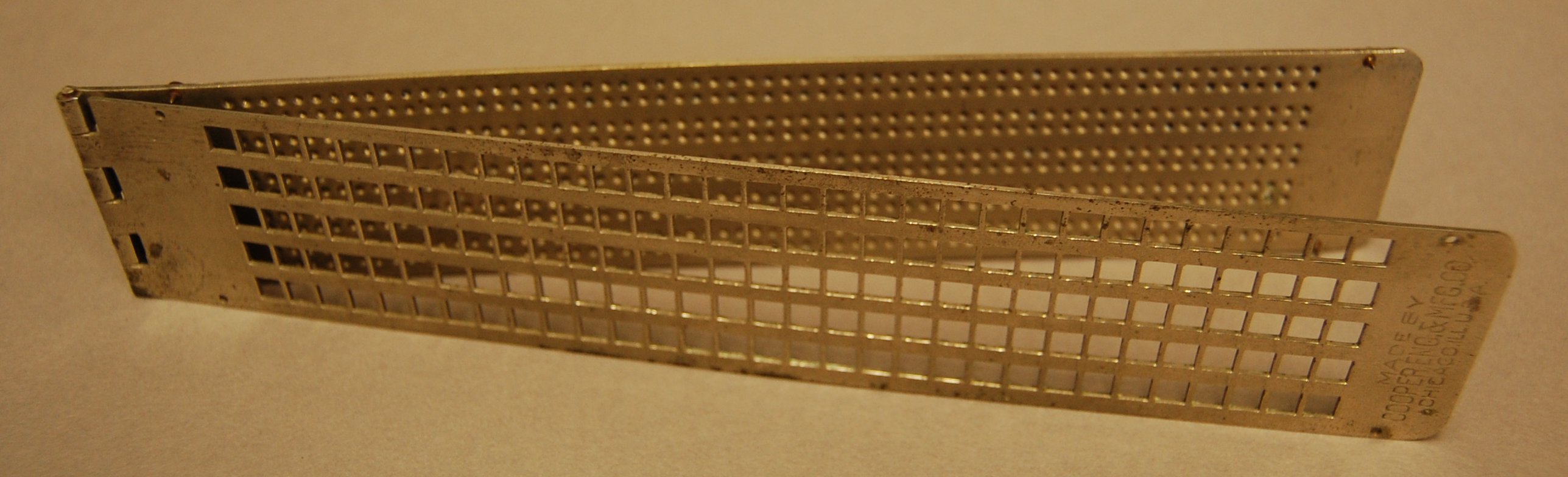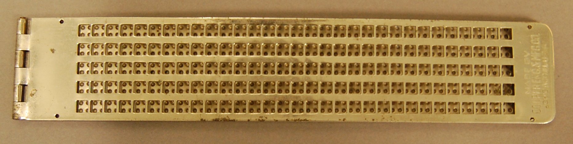 - Bright finish nickel alloy New York Point slate; four lines of 31 square cells; lower frame lined with rows of recessed dot guides; four brass pins up; piano hinge on short side, steel wire pin; stamped on end of top frame, "MADE BY COOPER ENG. & MFG. CO. CHICAGO, ILL. U.S.A."